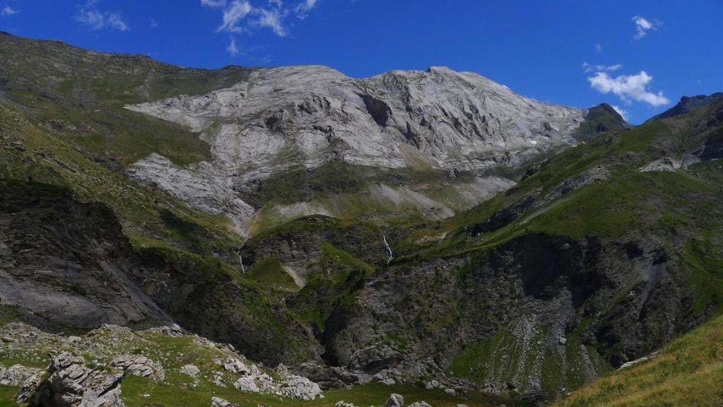 La senda faldea en ascenso hacia el N. Hay que atravesar varios barrancos pedregosos. Es curiosa, en algunas zonas prácticamente se pierde y cuesta seguirla, en otras está bien trabajada, incluso se ven terrones de hierba levantada para construirla. No sabemos para qué se ha hecho ni a dónde irá. Lo cierto es que la seguimos demasiado trozo hasta que nos damos cuenta de que teníamos que habernos desviado a la izquierda (2365m 2h31′). A la bajada seguimos mejor la ruta.