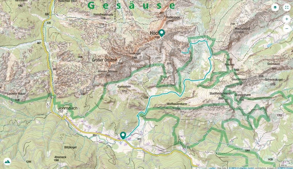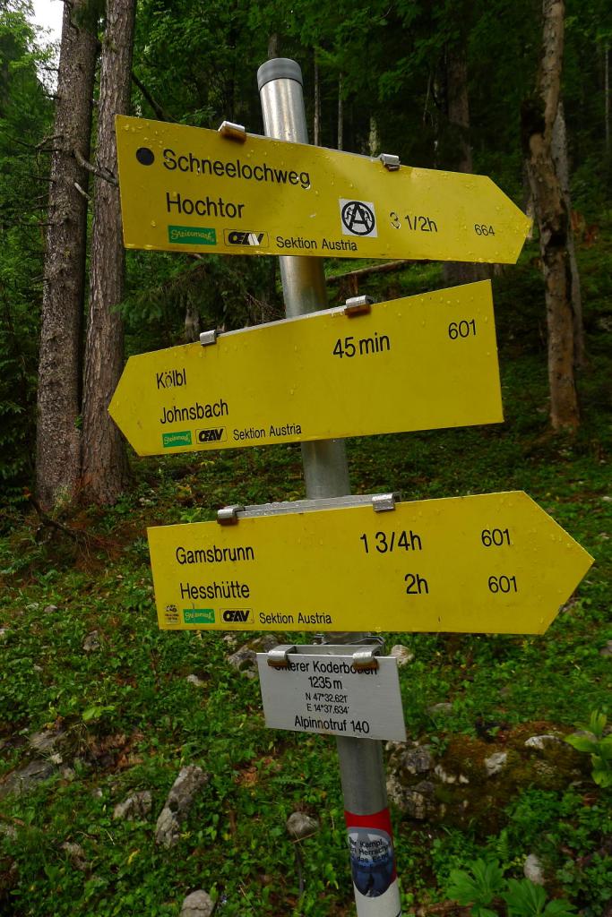 Iniciamos la marcha por el valle de Johnsbach . La localidad de Johnsbach se compone de dispersas casas a lo largo de la carretera. Aparcamos en una zona de aparcamiento junto a unos carteles que indican el inicio de la ruta a la izquierda de la carretera (Johnsbach 865m). Se sube por un camino. Desemboca en una pista que continúa a la derecha en descenso hasta la entrada de un granja. Justo antes de la granja sale una senda a la izquierda que se introduce en el hayedo.
