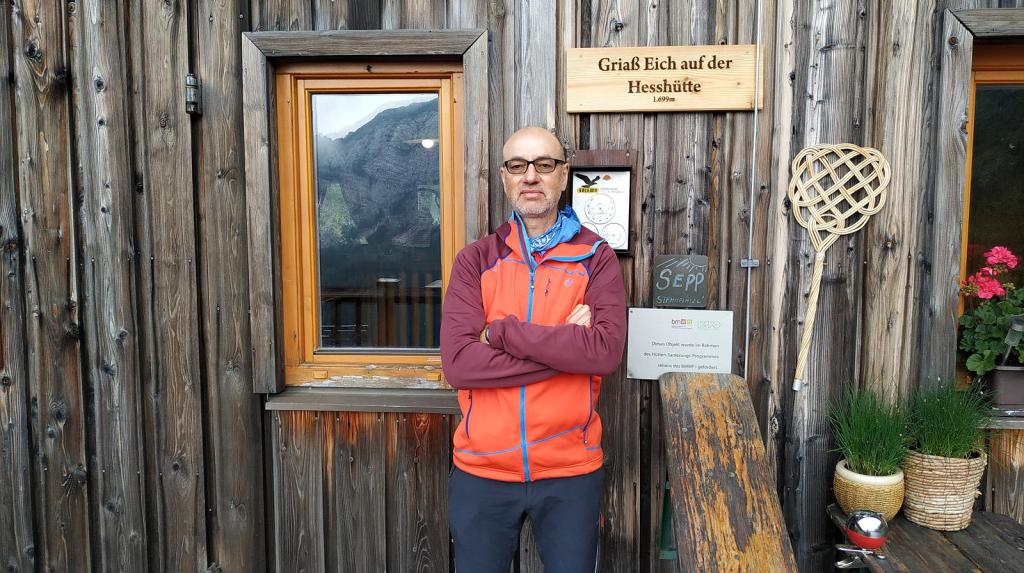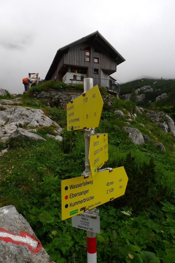 Desde aquí es más o menos llano, con algunas subidas y bajadas. Pasamos junto a una fuente y abrevadero (1635m 2h03′). Poco después hay un desvío a la derecha, seguimos recto, y ya podemos ver el refugio (Hesshütte 1699m 2h18′), situado donde termina la zona boscosa en un collado entre dolinas kársticas, bastante animado de gente; allí tomamos un té y seguimos (2h42′) atravesando la terraza del refugio.