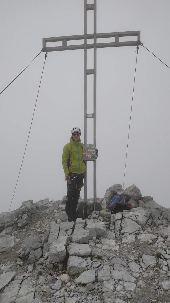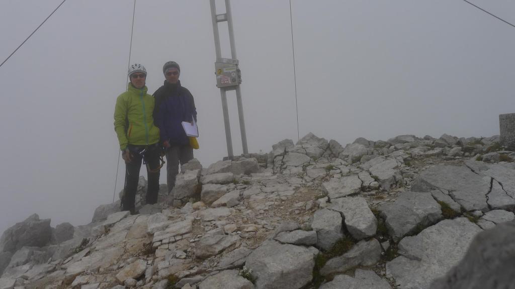 Por fin se llega a la cresta, se faldea hacia la izquierda con algún ligero descenso y se sube a la cumbre (Hochtor 2369m 4h36′). No tenemos más vista que la niebla que nos rodea, pero ha sido una interesante subida y hemos encontrado la roca bastante seca. Pongo un enlace para que podáis ver la panorámica del Hochtor. El descenso es muy entretenido y las sirgas son de mucha ayuda, pero tampoco necesitamos asegurarnos a ellas.