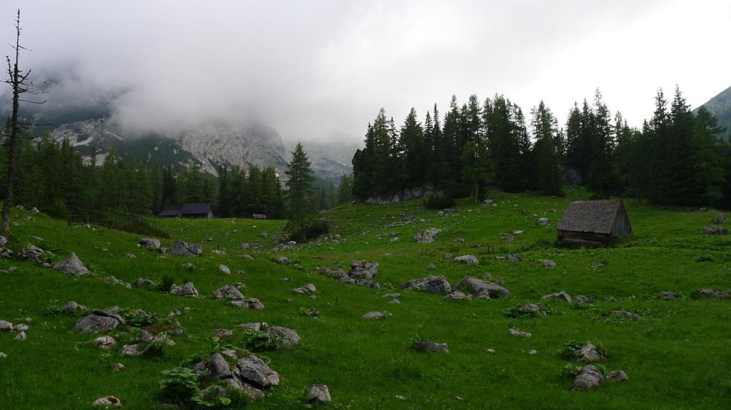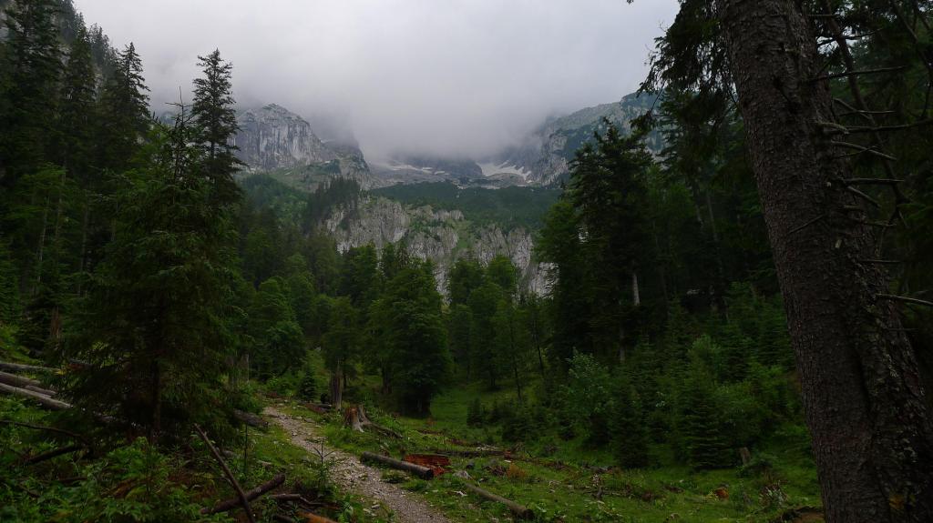 El sendero es pedregoso y un poco barroso y el hayedo se va transformando en frondoso abetal. Dejamos otra ruta a la izquierda y seguimos a la derecha (1235m 0h48′). Después hay otra bifurcación a la izquierda (1445m). Llegamos a una hondonada llana con cabañas y vacas (1580m 1h50′). Nos cae alguna gota, pero luego parece que se ve algún trocito de cielo azul.