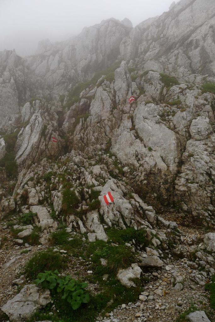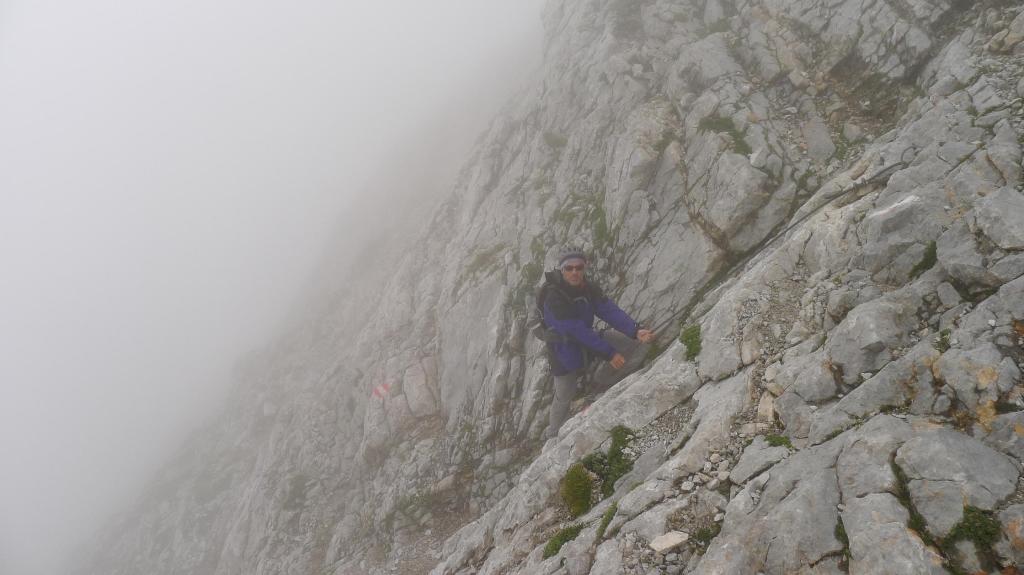 El camino, a través de la pedrera, se acerca a la pared. Encontramos la 1ª sirga (1835m 3h15′). Nos envuelve una densa niebla, apenas se ven unos metros delante de nosotros, pero la señalización es tan buena, con las marcas roja-blanca-roja, que no hay posibilidad de pérdida a pesar de ser un terreno complicado. Probablemente perder la ruta nos metería en serios problemas.