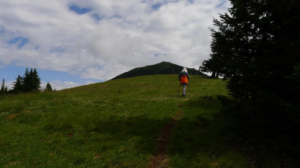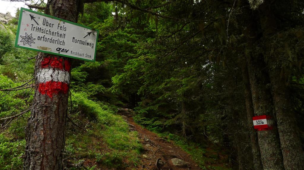 Desde el refugio de Hirschegger Sattle (1545m) cruzamos la carretera y ascendemos hacia el N por una pista en el abetal. Hay una bifurcación, la pista sigue a la derecha, nosotros recto (1560m 0h11′). El sendero avanza por el bosque, con la cerca de ganado siempre a nuestra derecha. La senda se vuelve un poco más pendiente y y rocosa que la del Ameringkogel y desemboca en el final de una pista siguiendo el sendero recto 1750m 0h35′).