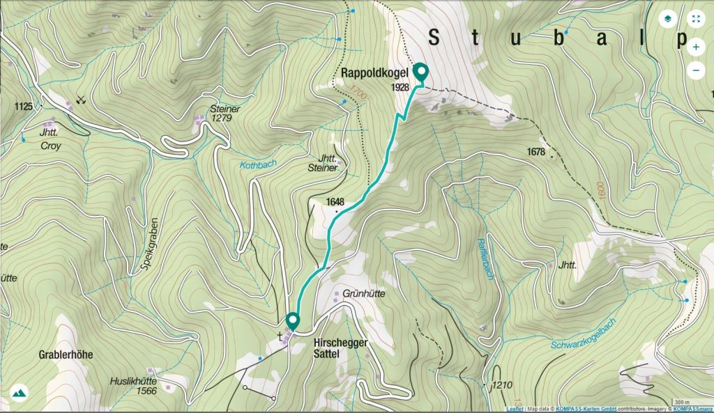 Se bifurca otra ruta hacia el pico a la izquierda, pero la vía normal es la de la derecha 1770m 0h38′). Más arriba se unen las 2 vías (1820m 0h44′). Tras un último repecho se alcanza la cima del Rappoldkogel (1918m 0h55′).