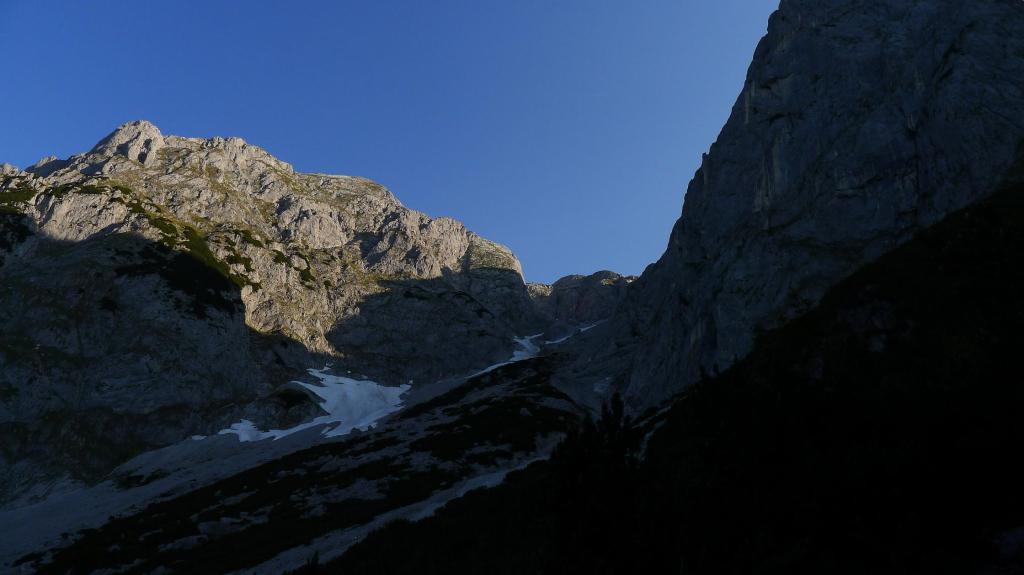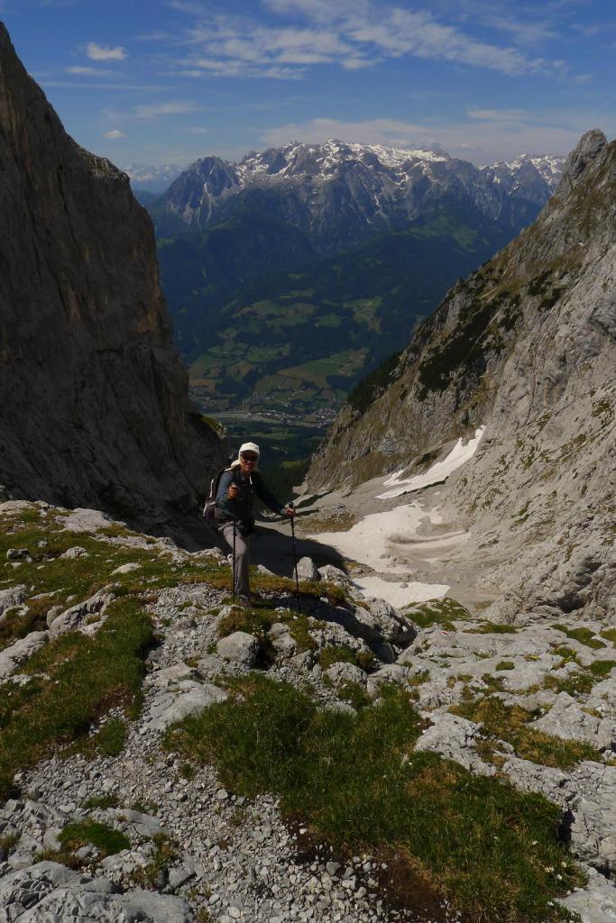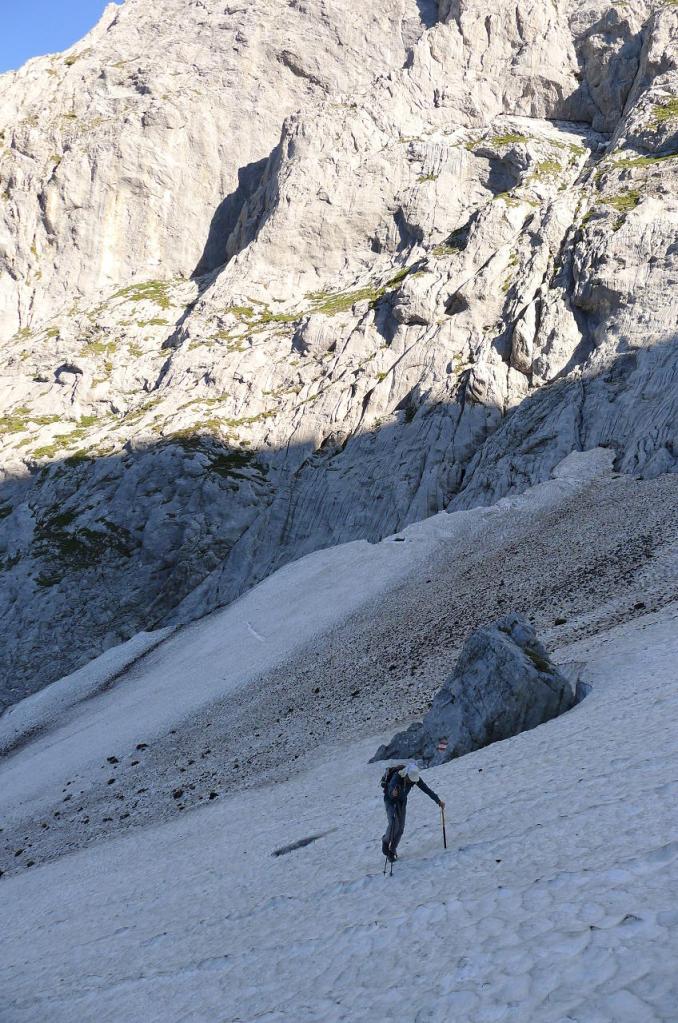 Avanza el sendero bajo la sombra del bosque y sale a cruzar unas grandes pedreras. Hay un desvío a la derecha hacia el refugio Werfener (1660m 1h21′); seguimos recto. La ruta se vuelve más pedregosa y rocosa. Asciende con fuerza sobre un cambio de pendiente que se introduce en una vertiginosa canal. Pasamos un nevero con nieve dura (echamos mano al piolet), luego una sirga (1870m 2h01′) y otro nevero.