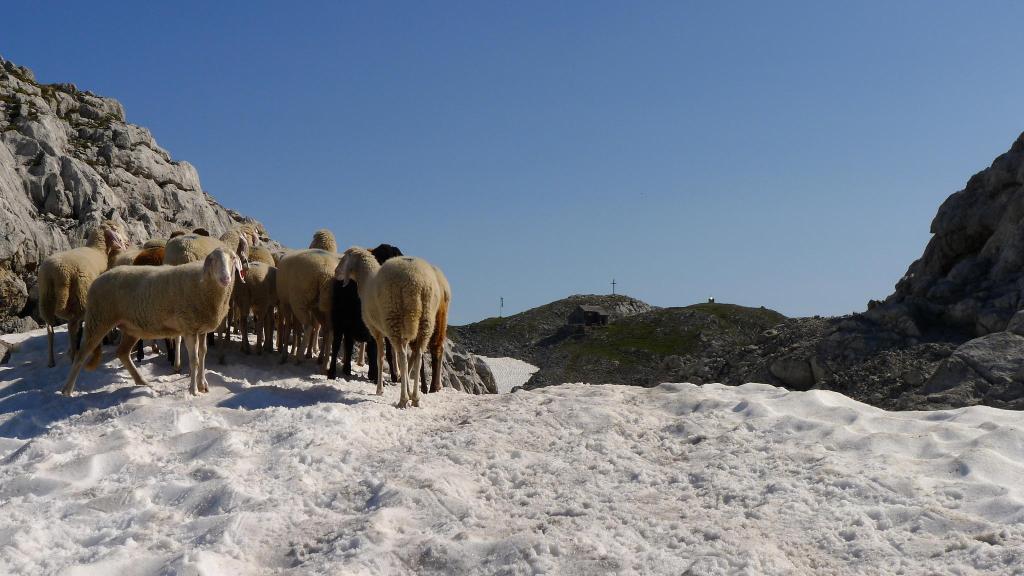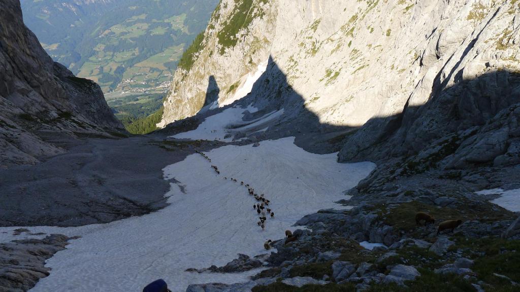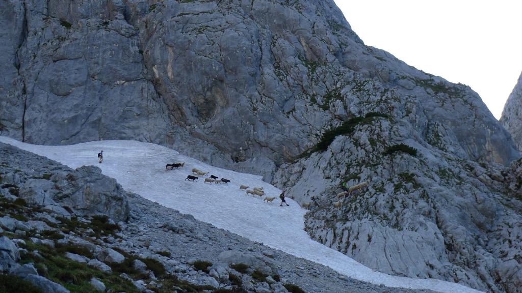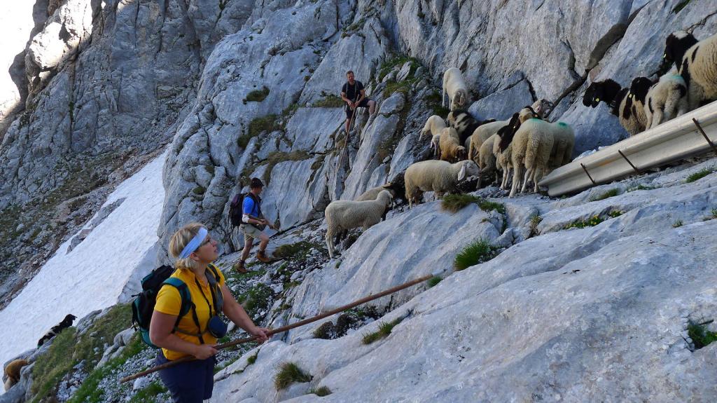 Por encima hay rebaños de ovejas con pastores. Las ovejas tienen problemas para pasar los neveros y trepar por las rocas. Para evitar otro nevero con bastante pendiente nos metemos más a la derecha de la ruta balizada, por donde van las ovejas, pero las ovejas tienen que pasar una vira pedregosa ligeramente protegida con un riel y empiezan a tirar piedras. Los pastores nos avisan (en alemán pero se entiende perfectamente) y tenemos que esperar a que superen este paso clave lo que supone el momento más peligroso del día por la caída de piedras. En cuanto pasan ellas nos lanzamos nosotros y nos vamos un poco a la izquierda para evitar la lluvia de piedras. Una fuerte pendiente nos lleva a recuperar el camino y llegar a una confluencia de 3 direcciones (Griesscharte 2270m 2h58′).