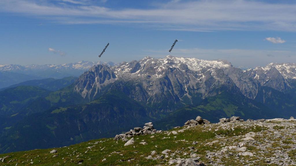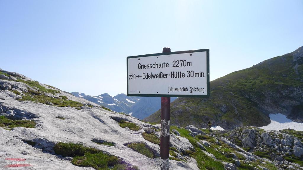 Tenemos un día magnífico y muy buenas vistas. Vemos el macizo del König y, justo detrás a su izquierda, el Grossglockner, el pico más alto de Austria. Llegan 3 checos, uno habla español. El balizamiento que hemos seguido es con puntos rojos en círculo blanco hasta Griesscharte, donde la pintura es antigua y solo se ve el punto rojo.