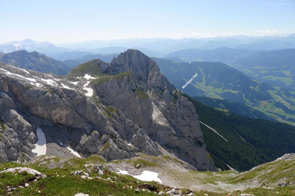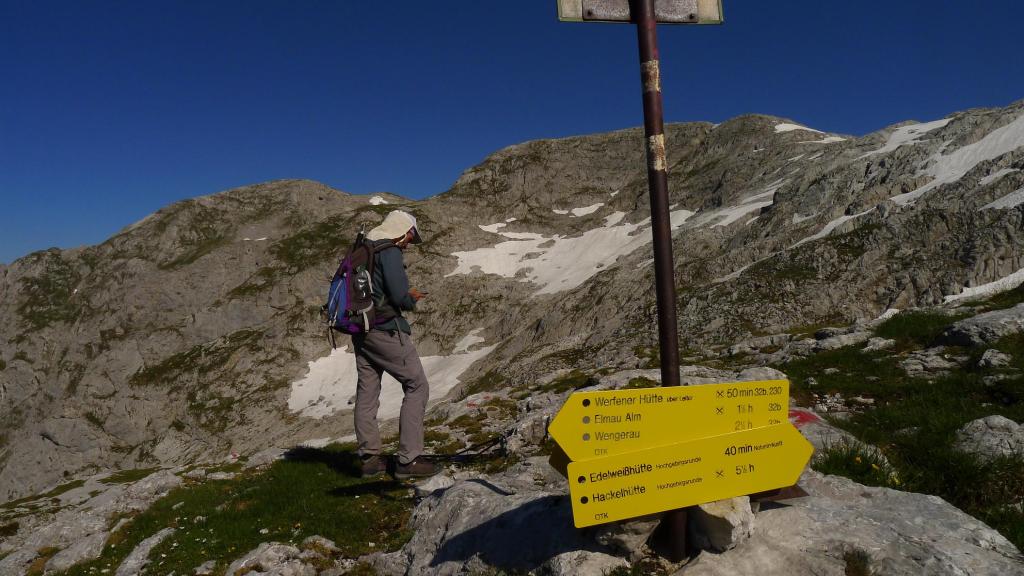 Desde este punto se va a la derecha (E) al refugio Werfener, situado en un espolón rocoso impresionante. La ruta normal a este refugio es desde el refugio Elmau (Elmaualm Werfenweg), otra de las rutas normales al Raucheck. Nosotros teníamos la información de que había que pasar una vertiginosa escalera metálica de unos 20m para salvar una pared de roca camino de la cima; probablemente esa ruta parte de esta confluencia hacia la izquierda (W), pero como seguimos hacia el refugio Edelweisser evitamos la escalera por otra vía más sencilla (quizá un poco más larga, no sabemos).