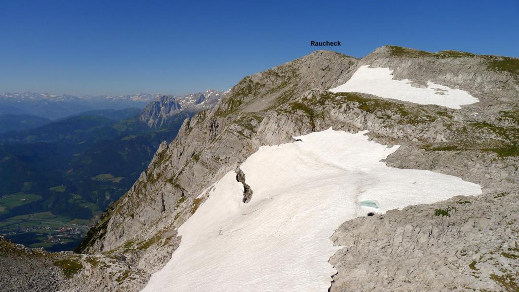 No tanto como ayer el Hochkönig, pero el Raucheck también presenta una ruta larga y trabajosa. Es la cumbre más alta de las montañas de Tennen (Tennengebirge). La cima es amplia y plana, fácil de alcanzar en su tramo final.