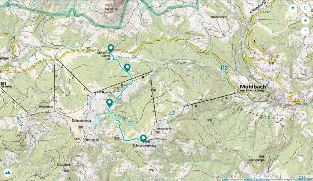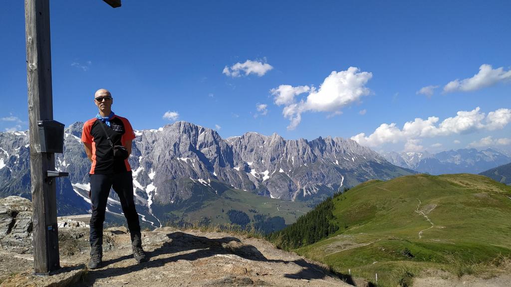 Para completar el día hacemos una segunda ascensión por la tarde al Schneeberg, una montaña de suaves contornos y terreno herboso, pero con excelentes vistas hacia el macizo del Hochkönig, que también es uno de nuestros objetivos. La cumbre principal se denomina Schneebergkreuz (hay otra cima un poco más al NE 17m más baja) y el nombre significa montaña nevada.