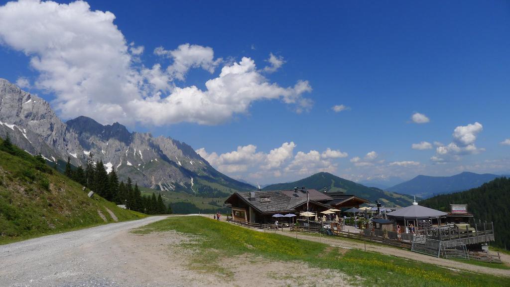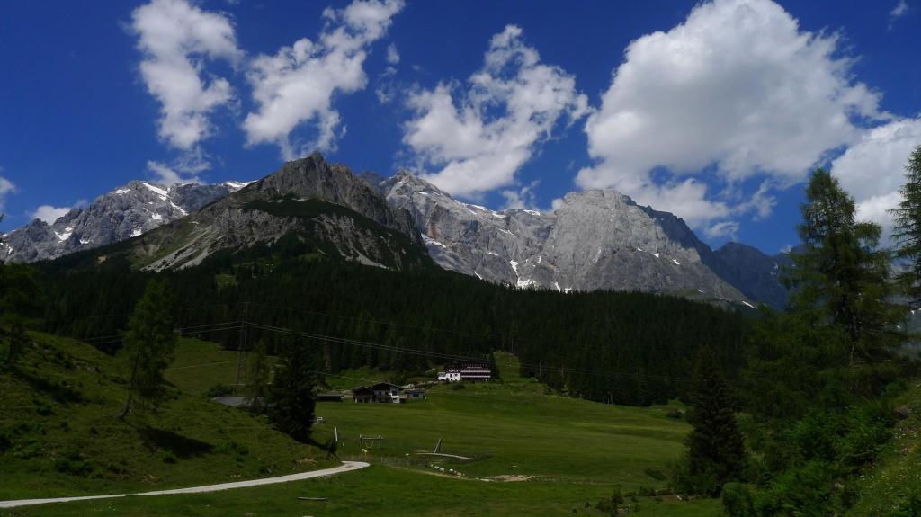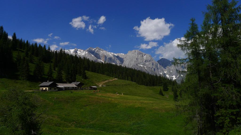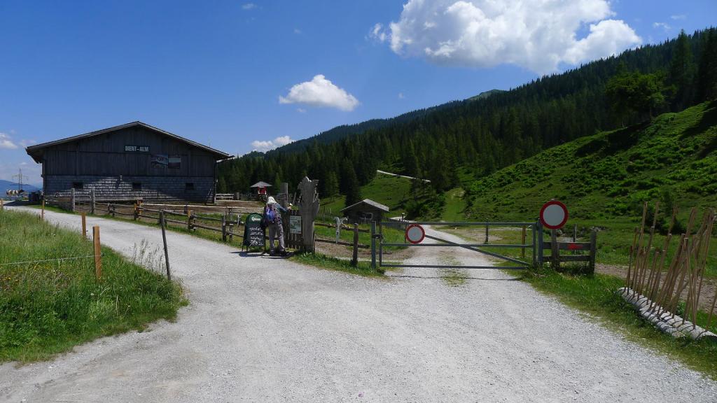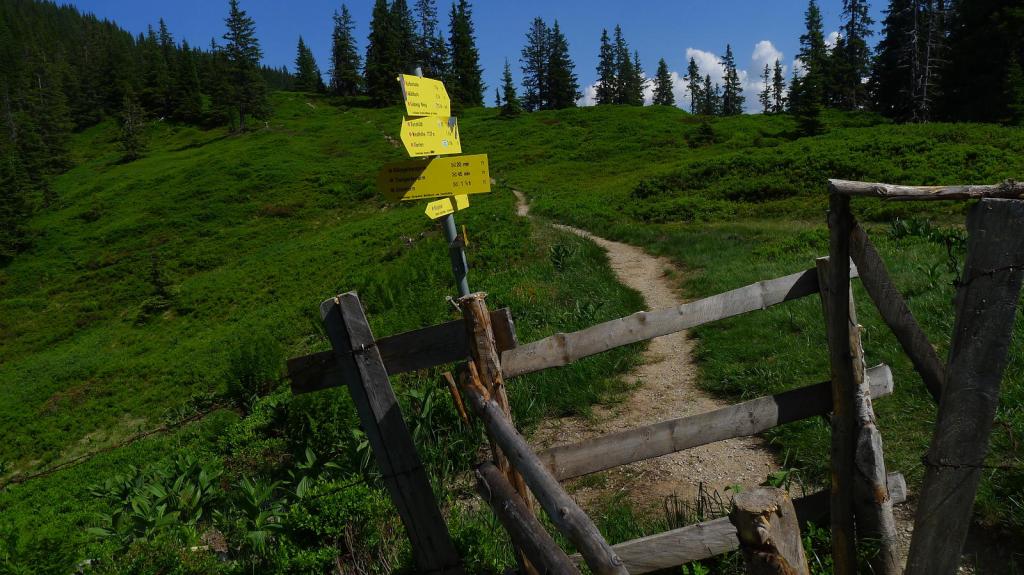 Aparcamos junto a una granja en un puerto de montaña (Dientener Sattle 1370m). Seguimos la pista por bosque de abetos hasta tomar un desvío a la derecha (1415m 0h13′). La pista continúa hasta un gran refugio-restaurante (1535m 0h29′). Luego se toma el camino de la izquierda (1540m 0h31′) que baja a una cabaña ganadera (1540m 0h44′).