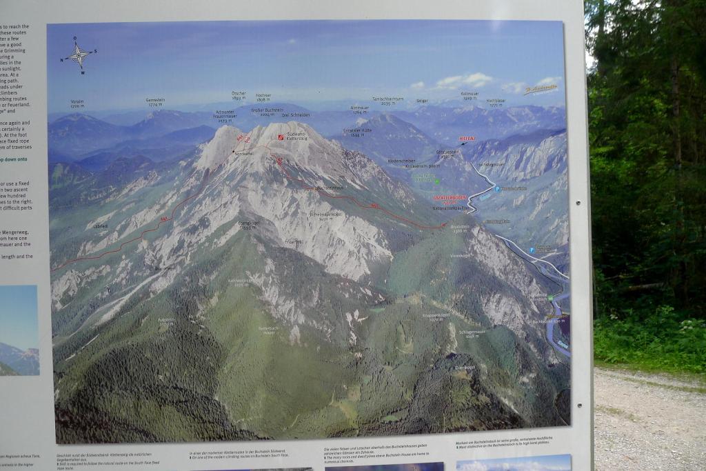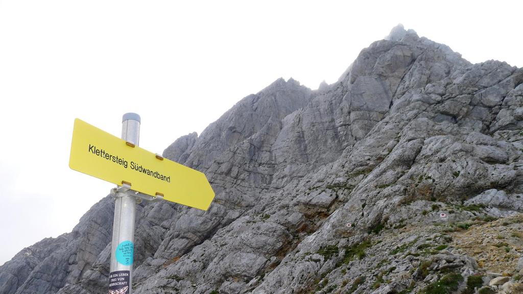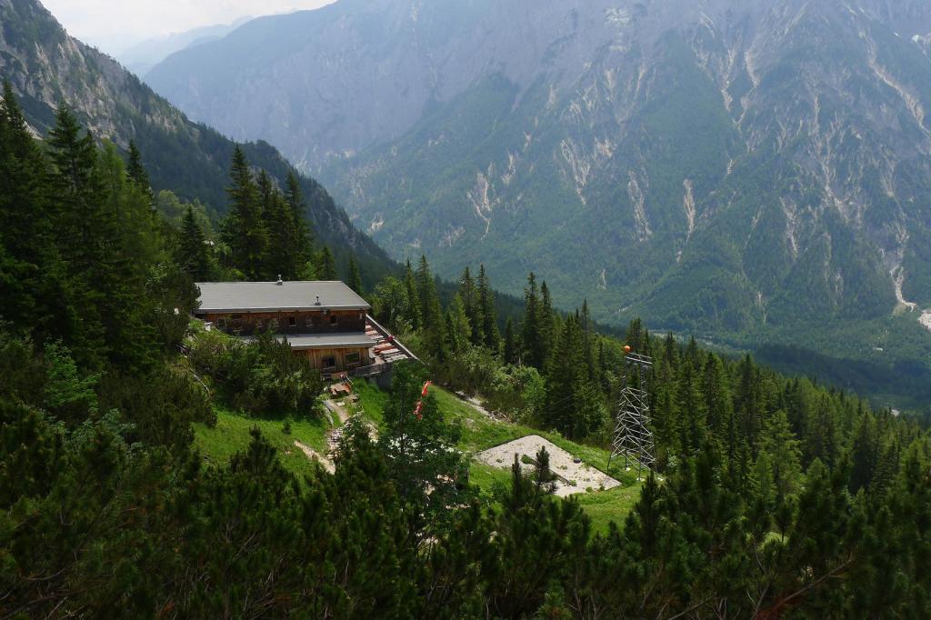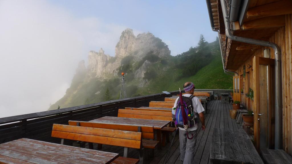 El piso de vegetación forestal acaba al llegar al refugio Buchsteinhaus (1570m 2h04′). No venden botellas de agua, pero nos rellenan las nuestras amablemente. Pasando por la terraza del refugio sigue la senda que sube a un espolón. A partir de aquí hay alguna vieja señal azul, pero las rojas y blancas son muy abundantes. El terreno se va haciendo rocoso y nos acercamos a la imponente pared.