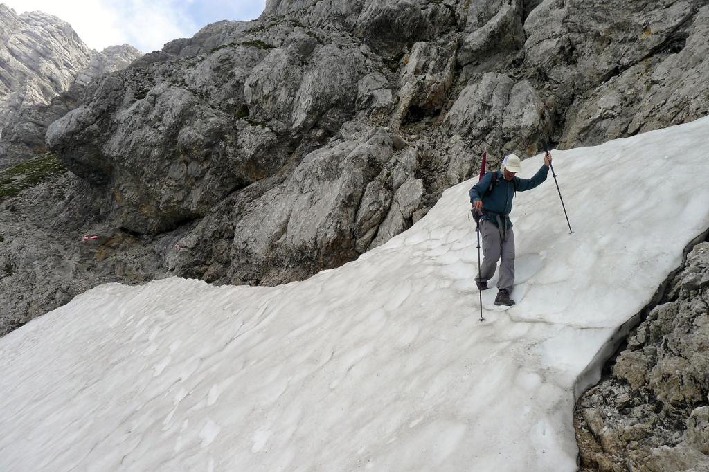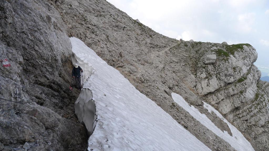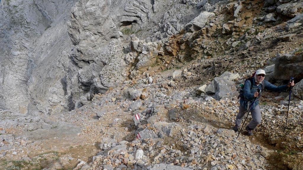 A la derecha se va a la 1ª ferrata difícil ( 1960m 3h04′) (puntos rojos en un círculo blanco). Seguimos la ruta normal que bordea la pared por el W. El camino es rocoso y vertiginoso. Pasamos un nevero, solamente 8 pasos pero con cuidado, y hay un par de sirgas para ayudarse más adelante. Llegamos al inicio de una 2ª ferrata (1960m 3h13′) que va hacia a derecha, más corta y más fácil, señalizada con azul.