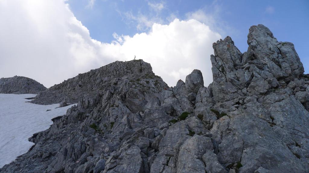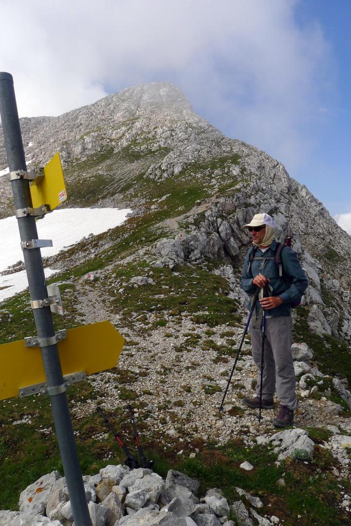 Tras un descenso llegamos a un cruce que seguimos a la derecha (1925m 3h27′) para introducirnos en una larga y pronunciada canal rocosa, con varias sirgas y una grapa. No supera el IIº pero hay que ir con cuidado y regulando el esfuerzo hasta un collado (2070m 3h46′), donde giramos a la derecha teniendo ya a la vista (cuando pasan las nubes) la cima.