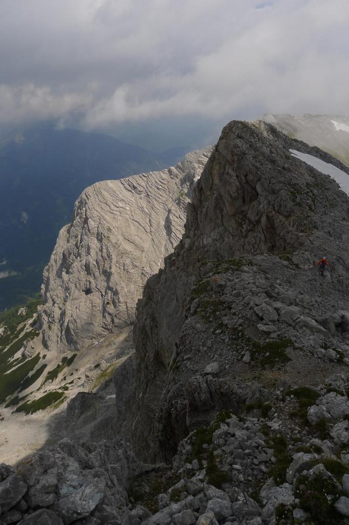 Al otro lado del collado hay un prado con gencianas y neveros. Avanzamos por un poco de hierba y luego otra vez roca hasta la cima (Grosser Buchstein 2224m 4h05′). La traducción del nombre de esta montaña es Gran Libro de Piedra, bonito nombre. El día está con nubes, nieblas y algún rato de sol. La bajada se hace larga. Paramos en el refugio 38′ para tomar un té y continuamos hasta la estación donde habíamos aparcado (580m 8h03′) descubriendo que era una parada de bus. El señor de la estación nos echa una pequeña bronca, pero no entendemos nada y hemos tenido el coche en la única sombra que había.