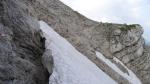 A la derecha se va a la 1ª ferrata difícil ( 1960m 3h04′) (puntos rojos en un círculo blanco). Seguimos la ruta normal que bordea la pared por el W. El camino es rocoso y vertiginoso. Pasamos un nevero, solamente 8 pasos pero con cuidado, y hay un par de sirgas para ayudarse más adelante. Llegamos al inicio de una 2ª ferrata (1960m 3h13′) que va hacia a derecha, más corta y más fácil, señalizada con azul.