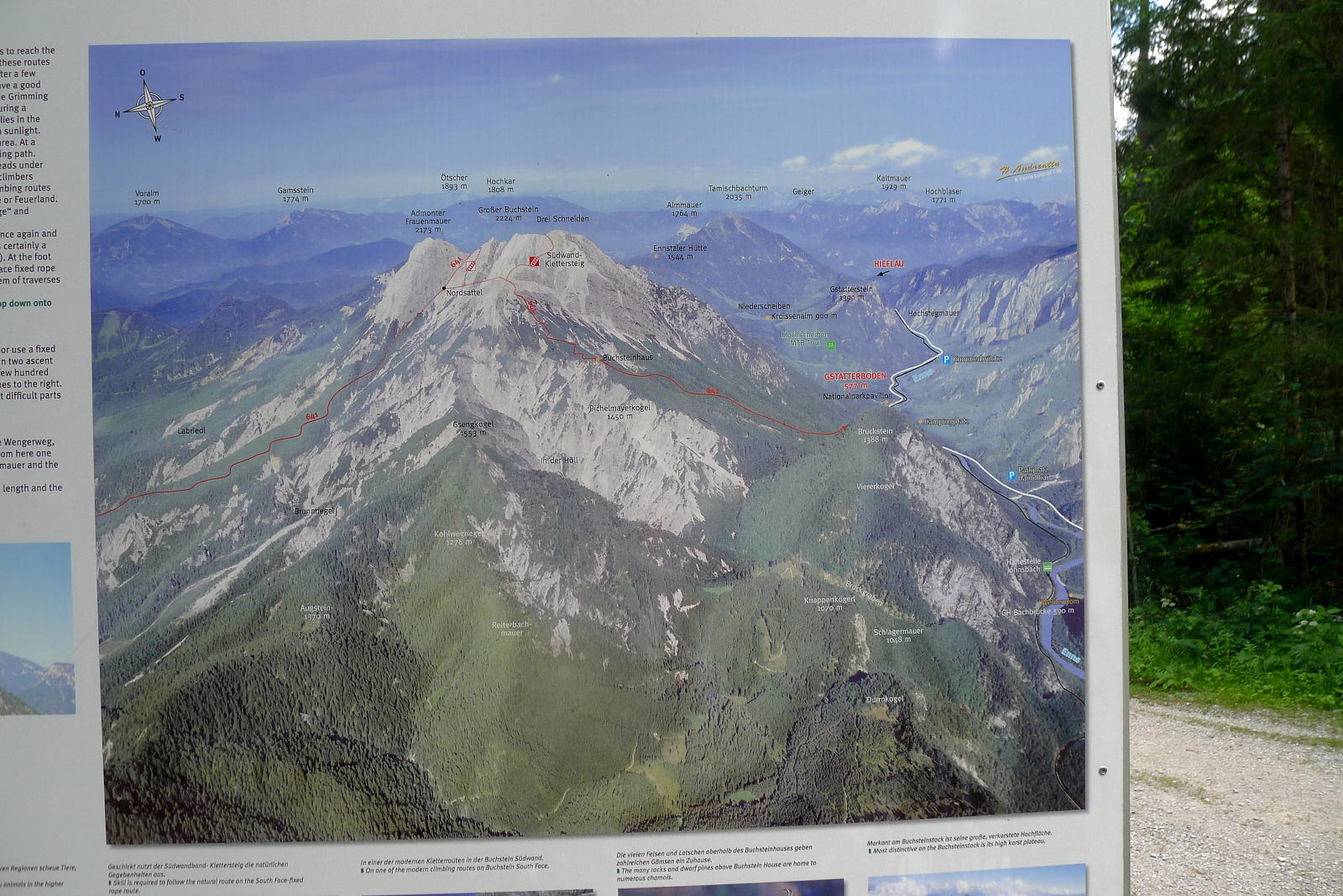 Llegamos en coche hasta el inicio de nuestra 1ª ascensión austriaca, aparcando junto a la estación de tren (Gstatterboden)(580m). Estamos en el Parque Nacional Gesäuse. Andamos unos metros por la carretera (hay carril para peatones y para bicis) y tomamos la pista que sigue de frente cuando la carretera gira a la izquierda para pasar el puente. La pista gira a la derecha, pero la senda sigue de frente, subiendo por el bosque. Avanzamos por un hayedo-abetal, con arces y serbales, siempre bien marcado con las señales rojo-blanco-rojo (sendero 641).