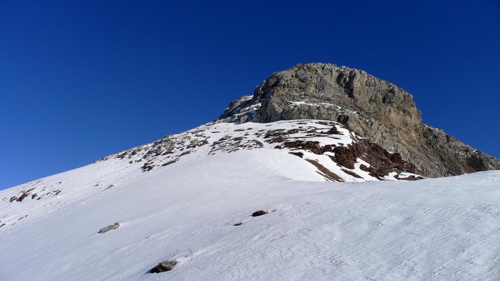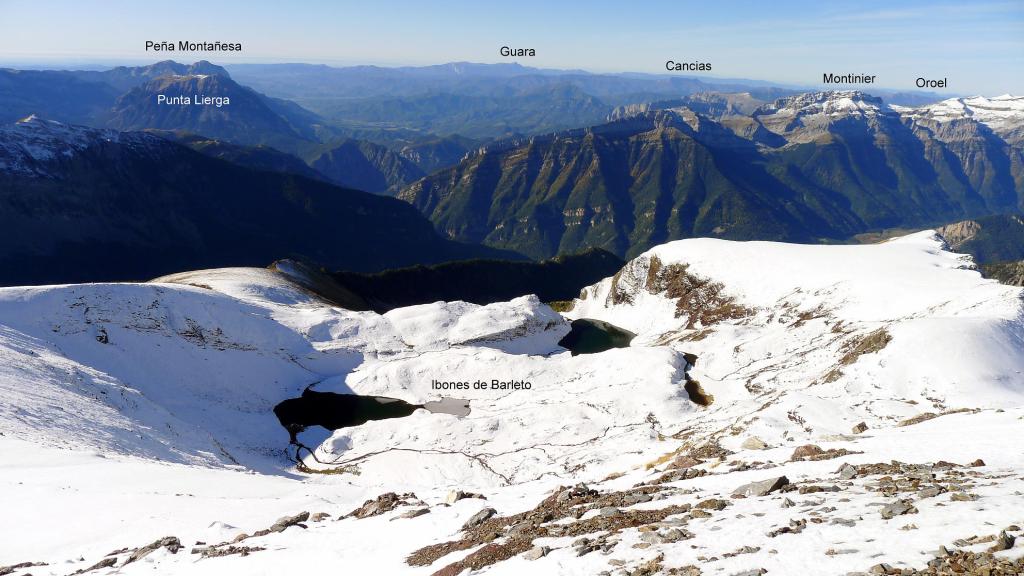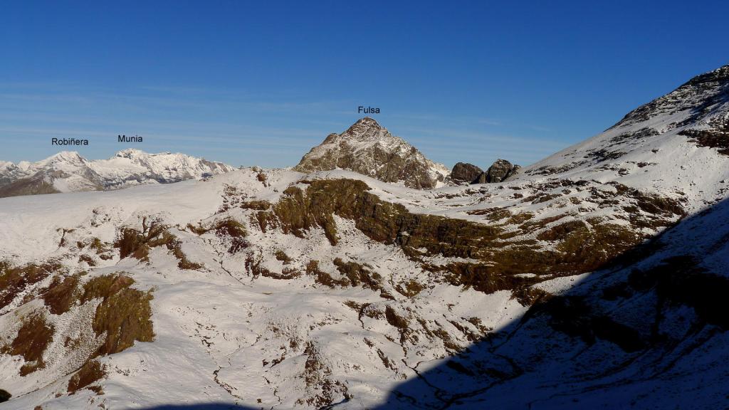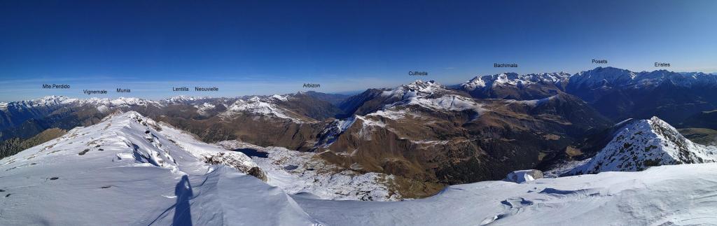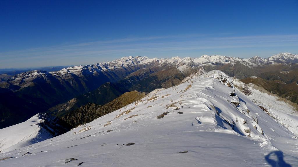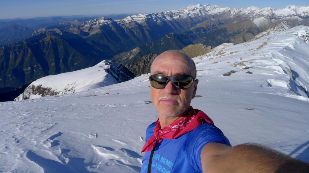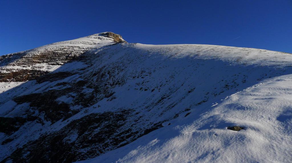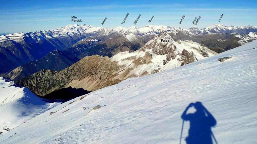 Hacia los 2850m el suave lomo se convierte en una torre rocosa que se evita por la izquierda. Hay unos pasos por inclinadas laderas en las que extremo la precaución aunque se cramponea bien. Unas últimas rampas fuertes y, enseguida, la cumbre de Punta Suelza (2972m 2h22′). Aquí arriba hace frío, pero he hecho toda la subida en manga corta. La atmósfera es clarísima, las vistas excepcionales.