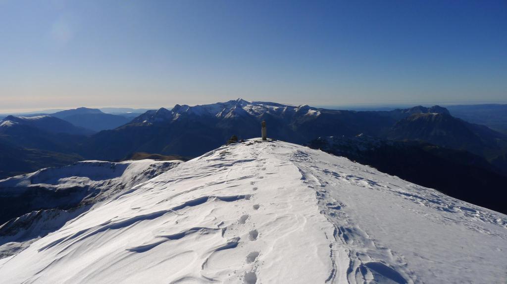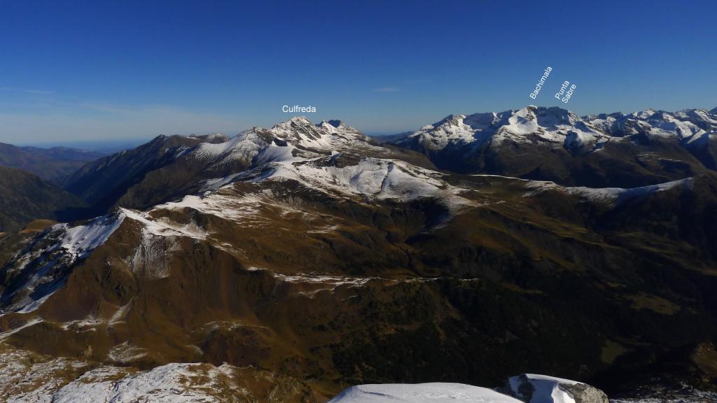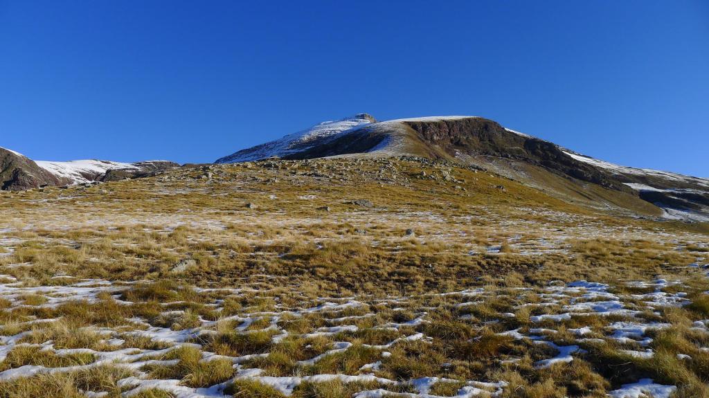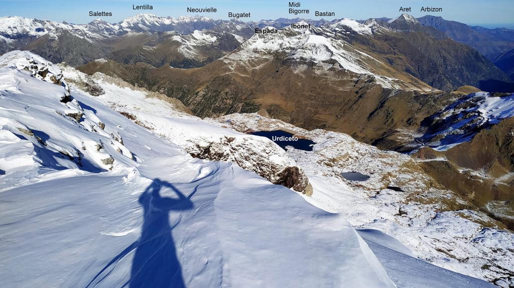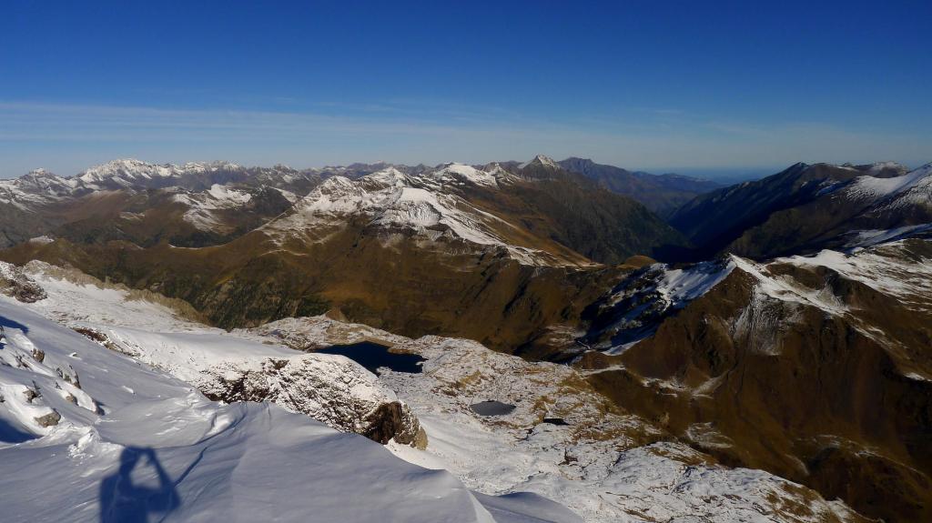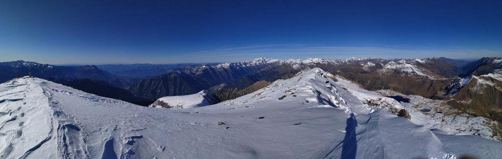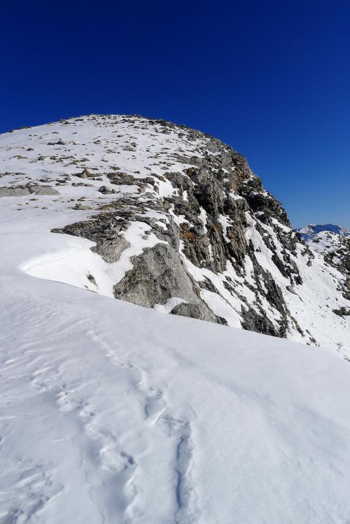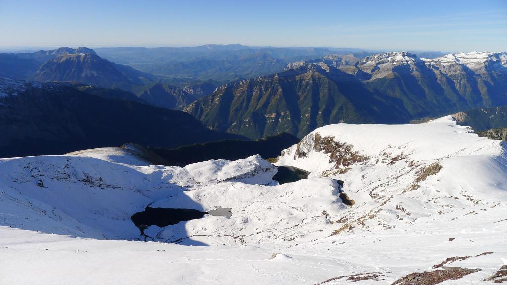 Hacia los 2850m el suave lomo se convierte en una torre rocosa que se evita por la izquierda. Hay unos pasos por inclinadas laderas en las que extremo la precaución aunque se cramponea bien. Unas últimas rampas fuertes y, enseguida, la cumbre de Punta Suelza (2972m 2h22′). Aquí arriba hace frío, pero he hecho toda la subida en manga corta. La atmósfera es clarísima, las vistas excepcionales.
