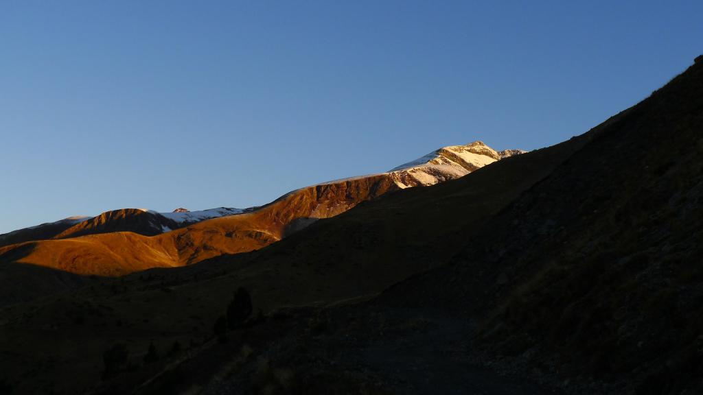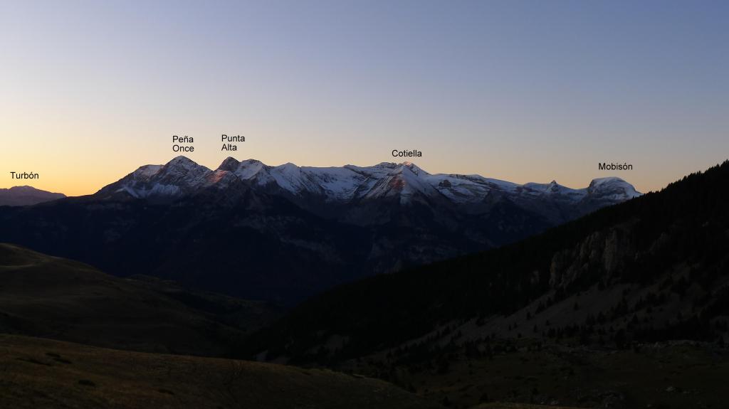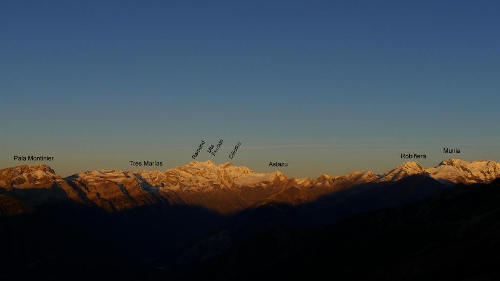Continúo andando por la pista 2.7km, pasando a la vertiente NW (espléndida vista del macizo de Monte Perdido al amanecer) y faldeando la ladera del Tozal d’Escubillons en ligero descenso hasta el refugio de Pardinas (2105m 0h30′), donde acaba la pista y encuentro unos amplios prados y cercados para el ganado.