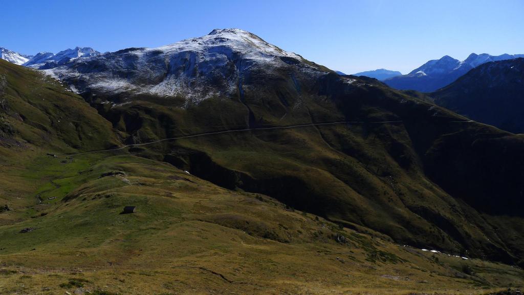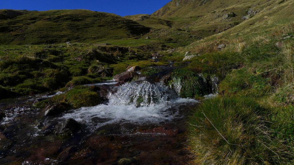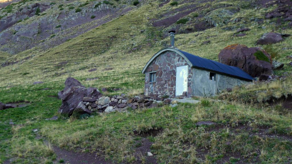 El camino no es claro entre el pasto, se sigue en dirección W, se atraviesa el riachuelo, se pasa junto a un abrevadero y se asciende por una vaguadita hasta otra cabaña (2175m 0h44′). Hay traza de senda y algún hito, pero en todo caso el objetivo es ascender hacia la derecha al hombro que tengo enfrente. Fuertes rampas herbosas me encaraman a este lomo que ya es la arista S de Punta Suelza y que tendré que seguir hasta la cima.