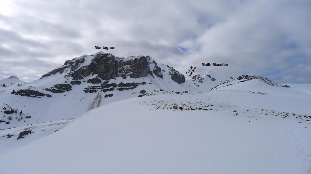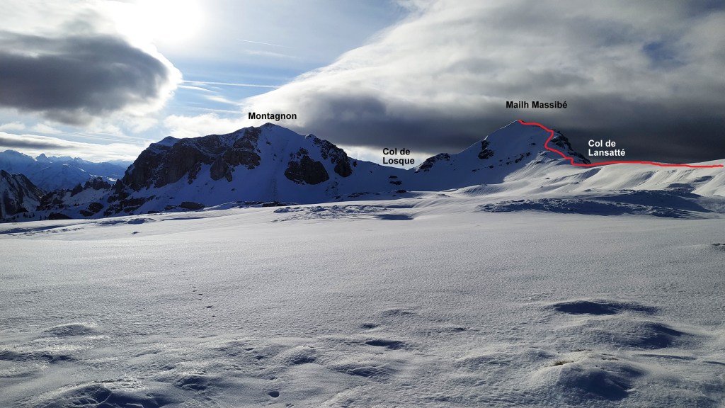 Frente a mi tengo que superar una fuerte pendiente (al final un poco en oblicuo, pero solo necesito los bastones) y, cuando llego arriba, ya veo el Mailh Massibé y el Pic Montagnon. Me encuentro sobre el lomo que se dirige a la ladera del Massibé. Siempre en dirección S llego al cambio de pendiente para afrontar la pala final. Saco las raquetas de la mochila y las dejo ahí. Cojo el piolet (Col de Lansatté (1855m 2h38′).