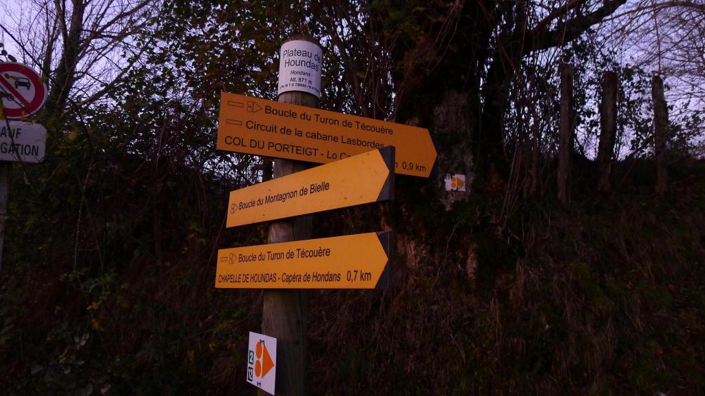 Como vengo desde el túnel de Somport, tengo que descender por el valle de Aspe hasta pasar el pueblo de Sarrance. Después me desvío a la derecha para ascender el col de Marie Blanc y descender 6 km por la vertiente E hasta la Capilla de Houndas. Enfrente de la capilla sale una carretera que sigo hasta donde está prohibida la circulación, aparcando en una explanada. Solo hay una furgoneta y un francés preparándose para salir. Como no veo demasiada nieve le pregunto si cree que son necesarias las raquetas y, siguiendo su consejo, las pongo en la mochila. Realmente las utilizaré un buen tramo a la bajada, cuando la nieve ya está un poco más blanda.
