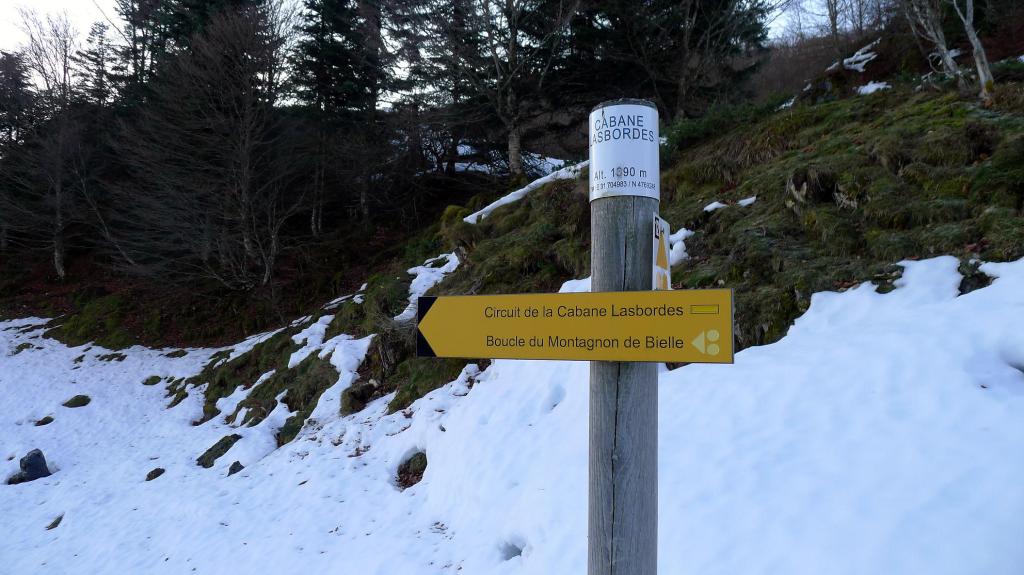 Se llega a un hombro con un paso estrecho en descenso sin nieve, así que tengo que quitarme las raquetas; pero luego hay una ladera fuerte con nieve y saco el piolet, bajando entre nieve revuelta por avalanchas hasta la cabaña Crambots (1455m 4h16′). Desde allí una senda con hitos entre el bosque nevado ataja la pista que va al punto de confluencia con unos carteles (1310m). Subo a la cabaña Les Bordes para tomar la misma senda de subida hasta el aparcamiento en el plateau de Hondas (870m 5h07′).