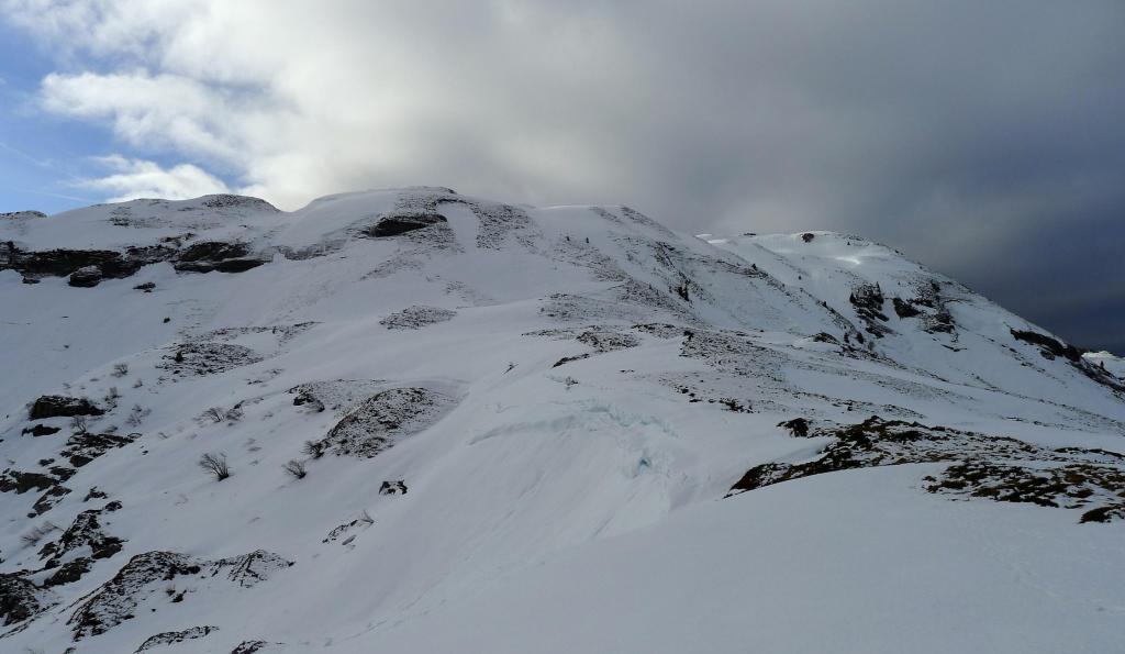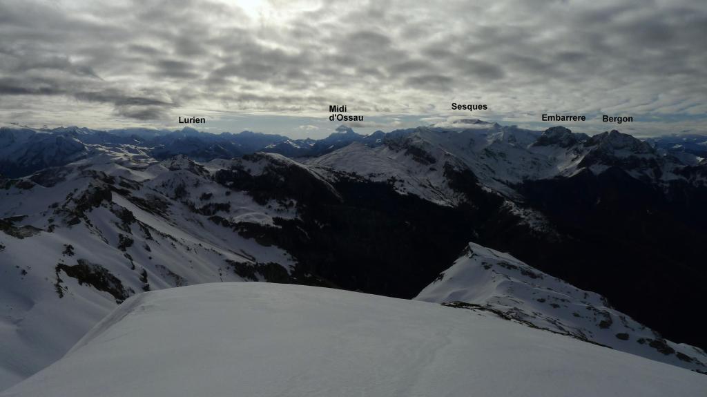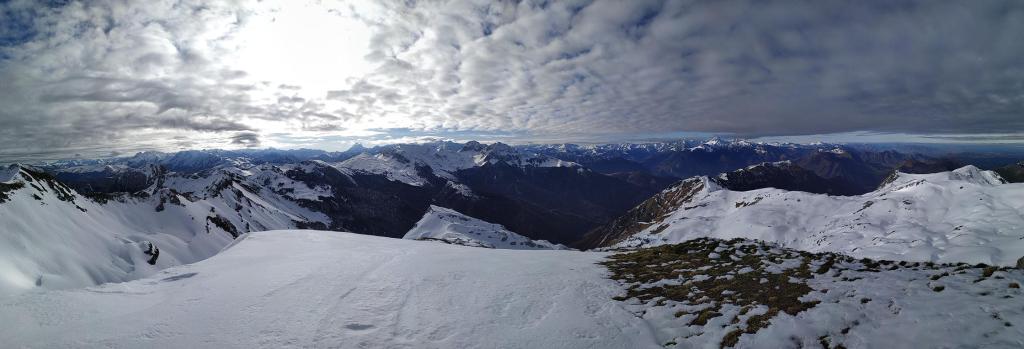 La pendiente es fuerte y la nieve forma mucho zueco. La cresta me lleva directamente a la cumbre del Mailh de Massibé (1973m 2h53′). Aunque la vista es buena unas nubes oscuras, aunque no amenazantes, tapan bastante parte del cielo y cubren algunos picos a mi alrededor.