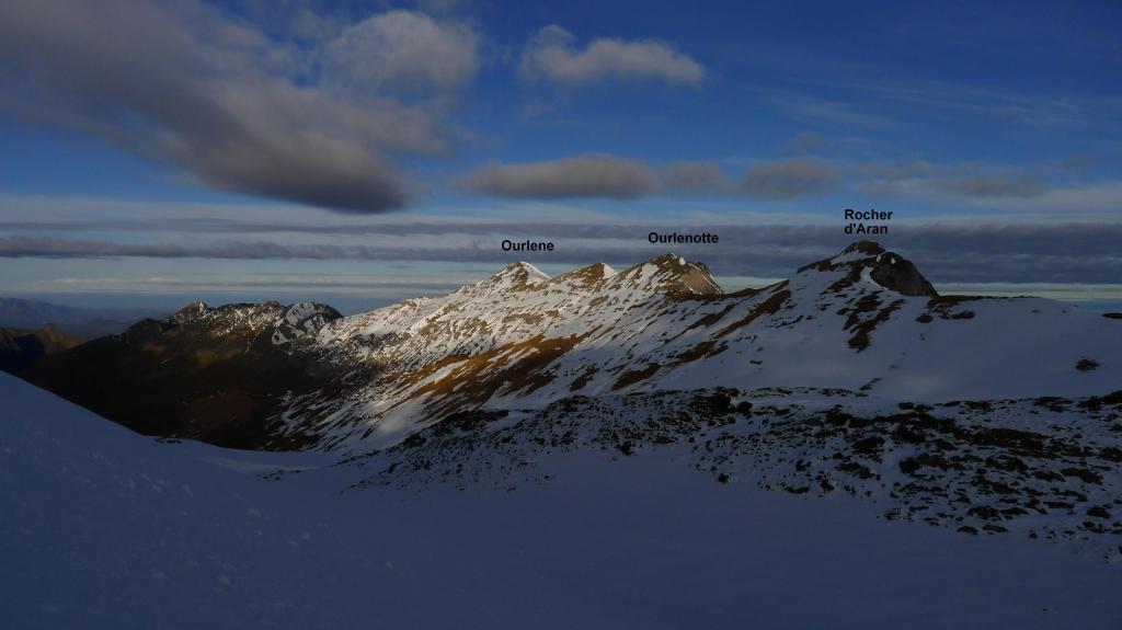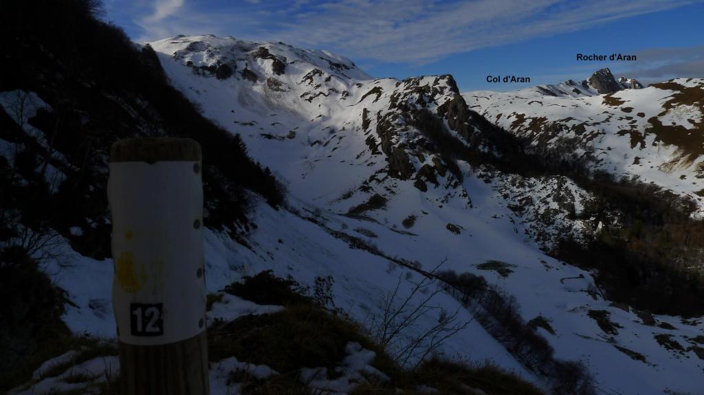 Sigo la pista que enseguida gira a la derecha, yo voy recto (derecha 1330m 1h04′), primero por el fondo de la vaguada, luego un poco a la derecha a media ladera. En un paso estrecho con nieve de pequeñas avalanchas tengo que ponerme los crampones, y continúo subiendo a media ladera hasta el Col d’Aran (1654m 1h22′). Hacia el NW están el Rocher d’Aran y el Pic de l’Ourlene, para otra ocasión. Hacia el S sigo más o menos el lomo que se introduce en un gran plateau con varios lomitos y mucha nieve.