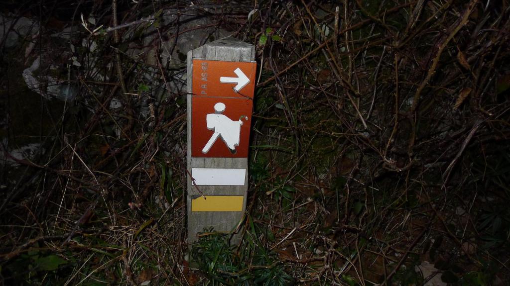 La ruta está bien señalizada como PR-AS-65 con pintura amarilla y blanca y en algunos puntos con flechas amarillas y una T de Tiatordos.