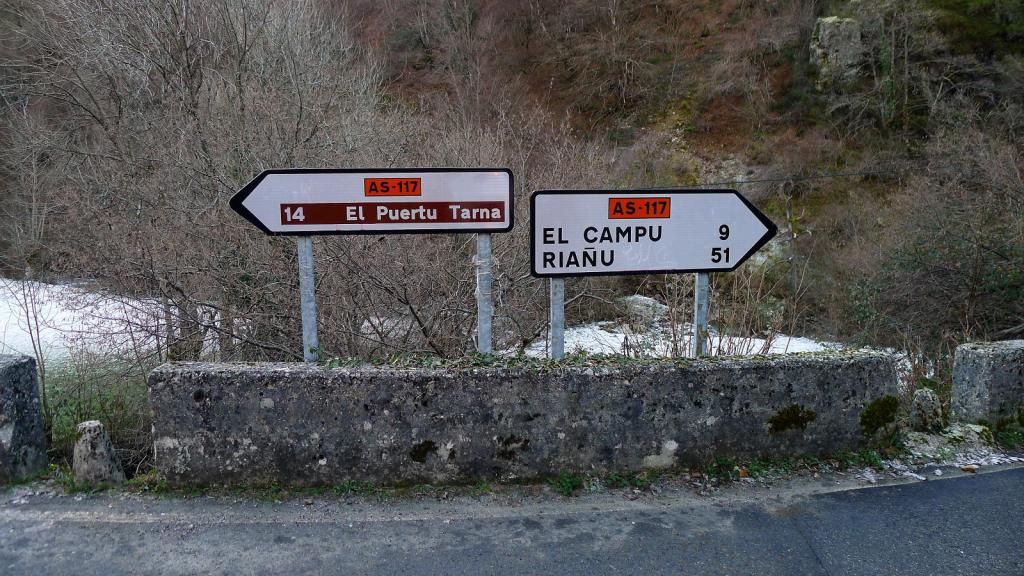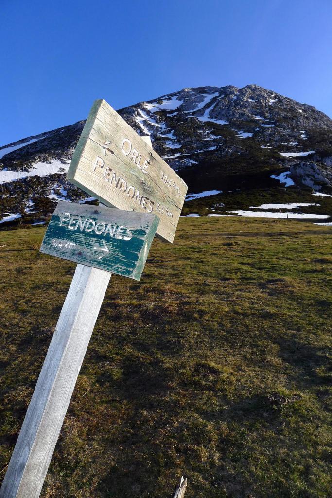 Siguiendo el valle del río Nalón se deja la carretera para subir al pueblo de Pendones, donde hay un buen aparcamiento (757m). Metido en el fondo del valle de Pendones, apenas entra el sol y los campos están medio nevados medio helados. Se toma la pista asfaltada de circulación restringida hacia el NE que discurre por encima de la orilla derecha del arroyo Pendones. Se acaba el asfalto y continúa pista de tierra hasta una primera bifurcación a la derecha (825m 0h13′), dejando otra pista en subida a la izquierda. Inmediatamente se pasa un puente y se gira a la izquierda. Un poco más arriba otro desvío a la derecha (870m 0h 19′).