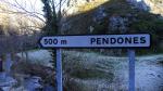 Siguiendo el valle del río Nalón se deja la carretera para subir al pueblo de Pendones, donde hay un buen aparcamiento (757m). Metido en el fondo del valle de Pendones, apenas entra el sol y los campos están medio nevados medio helados. Se toma la pista asfaltada de circulación restringida hacia el NE que discurre por encima de la orilla derecha del arroyo Pendones. Se acaba el asfalto y continúa pista de tierra hasta una primera bifurcación a la derecha (825m 0h13′), dejando otra pista en subida a la izquierda. Inmediatamente se pasa un puente y se gira a la izquierda. Un poco más arriba otro desvío a la derecha (870m 0h 19′).