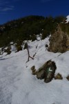 En Castiello de Jaca (850m) empieza el camino en la orilla derecha del barranco Redigüe. Enseguida hay que cruzar el barranco con cuidado al pisar las piedras heladas. El primer punto que registro es el desvío a la ermita de San Bartolomé (1160m 0h58′); está a unos metros de la pista, pero no es más que una pared ruinosa.