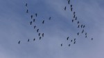 El recorrido de vuelta es el mismo que el de subida hasta Castiello de Jaca (850m 4h02′). En la cresta de la sierra de los Ángeles un sonido vocinglero llama mi atención; al elevar la vista descubro varios bandos de grullas que, tras unos vuelos dubitativos, se encaminan con sus clásicas formaciones en V para atravesar el Pirineo sobre los picos del Aspe. Ha llegado el momento en que se dirigen hacia sus cuarteles de verano para la reproducción después de pasar el invierno en Extremadura y Andalucía y hacer una pausa de descanso en las lagunas de Gallocanta.