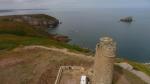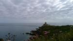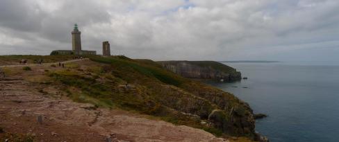 Subimos a lo alto del faro para disfrutar de las vistas, aunque el día es muy neblinoso. Después recorremos el cabo, con sus altivas formaciones rocosas y retomamos el camino de vuelta a Fort la Latte (59m 2h31′).