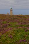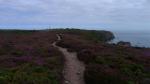 El camino se introduce al principio entre una bóveda de árboles y helechos, siguiendo la línea de la costa. Luego se abre y estamos rodeados de brezales con sus flores violetas, hasta llegar al cabo Frehel (69m 1h09′), donde se alza el faro.