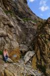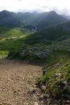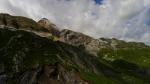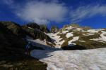 Entramos en una amplia hondonada a la derecha de la Zapatilla, progresando por prados con algún nevero todavía. De hecho avanzamos demasiado, tenemos que retroceder porque nos hemos pasado la desviación a la izquierda que atraviesa una pedrera (traza de senda) para situarnos bajo la característica brecha (2110m 2h22′) donde recomienza la ferrata.