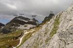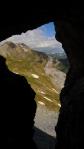 Como el día amenaza tormenta salimos muy temprano aparcando en la caseta que hay al inicio de las pistas de fondo de Candanchú (1610m). Algunas rutas van a encarar directamente las pedreras a la izquierda de la Zapatilla, pero nosotros ascendemos por la pista de esquí; aunque da más vuelta, facilita el avance. Cruzamos en diagonal bajo la banda rocosa de la izquierda de la Zapatilla, pasamos junto a la boca de una cueva (1865m 0h54′) y ya solamente hay que subir unos metros por la pedrera parda y cruzarla para llegar al inicio de la ferrata (1920m 1h08′).