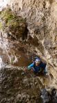 Aquí está la placa que conmemora la 1ª ascensión. Nos aseguramos a la línea de vida y ascendemos una chimenea. Tras ella se suceden viras diagonales entre roca y algo de vegetación, con más o menos inclinación según tramos. Se llega a una zona poco inclinada donde acaba la sirga (2000m 1h47′).