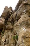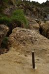 Un nuevo cartel, a la derecha la Fajeta, a la izquierda clavijas (2025m 1h31′). Y un poco más arriba encuentro el primer tramo de clavijas donde hay 3 clavijas sobre una laja de piedra inclinada que se superan simplemente gateando. Después el segundo tramo, una chimenea vertical con 6 clavijas estratégicamente situadas para superar estos 10m que calculo son de IIIº y que serían bastante arriesgados sin esta ayuda. Realmente no me atrevería a bajarlos sin asegurar, pero como pienso bajar por la Fajeta, echo un vistazo y allá voy.