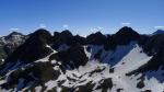 A mi izquierda estaría la ruta a los Infiernos, delante tengo el ibón semihelado de Tebarray y, tras el ibón y a su derecha, el pico Tebarray. Una traza de senda faldea la pedrera por encima y a la derecha del ibón. Como me encuentro un nevero duro tengo que bajar unos 10m por la pedrera esquistosa y recuperar luego el sendero. Tras un tramo de subida un poco más agreste se llega a una brecha, el cuello de Tebarray (2770m 3h30′) por donde se pasa hacia el refugio de Respomuso. Sin pasar la brecha, siguiendo por este lado, empieza la ascensión por la cresta ESE, con buena traza de senda que, sin dificultad técnica, me lleva a la cima del Tebarray (2886m 3h42′). Magnífico día para disfrutar de la cumbre y de las vistas.