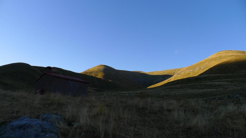 Salgo de frente al aparcamiento y tomo la pista a la izquierda hasta conectar con el GR-11 (1418m 0h08′) que viene del refugio. En la primera bifurcación a la izquierda se va a Taxeras y a la derecha (1545m 0h26′) sigue el GR-11. Tras una subida un poco más fuerte se entra en una zona de hierba bien pastada por ganado y bastante llana, llamada Plandaniz. Se llega así al refugio forestal (1651m 0h50′). Y un poco más arriba el refugio Diostesalve (1720m 1h02′) que queda en un alto a mi izquierda, así que no subo a verlo.