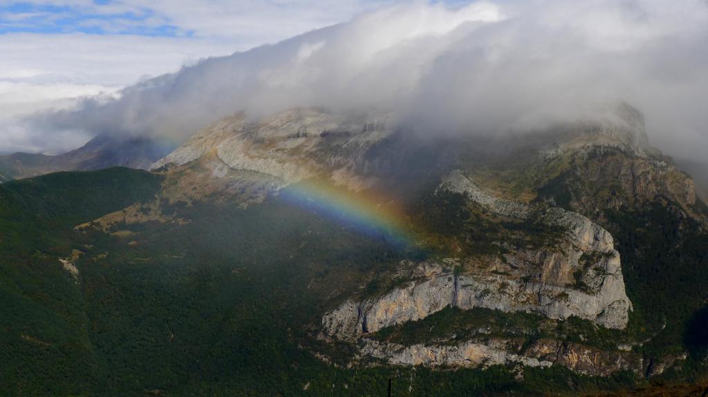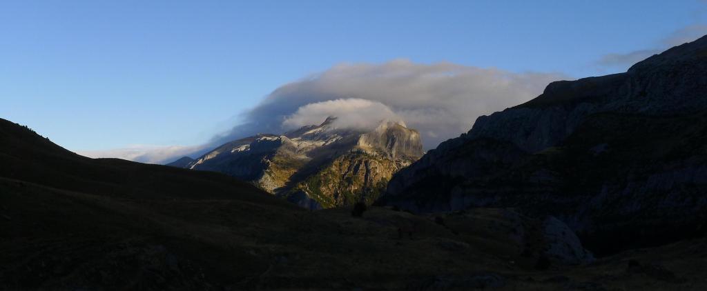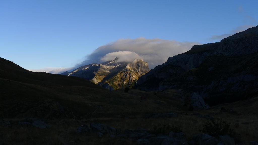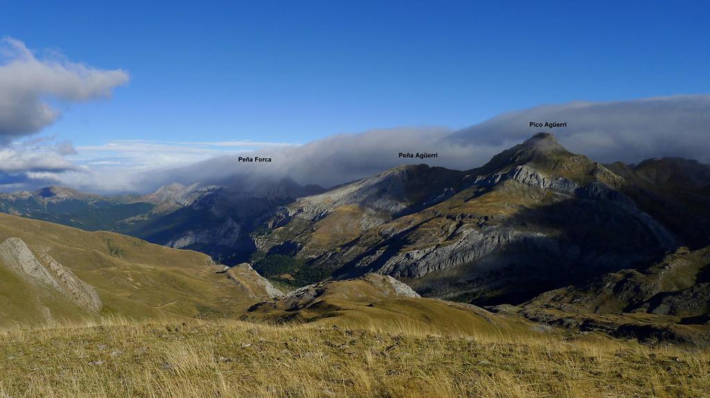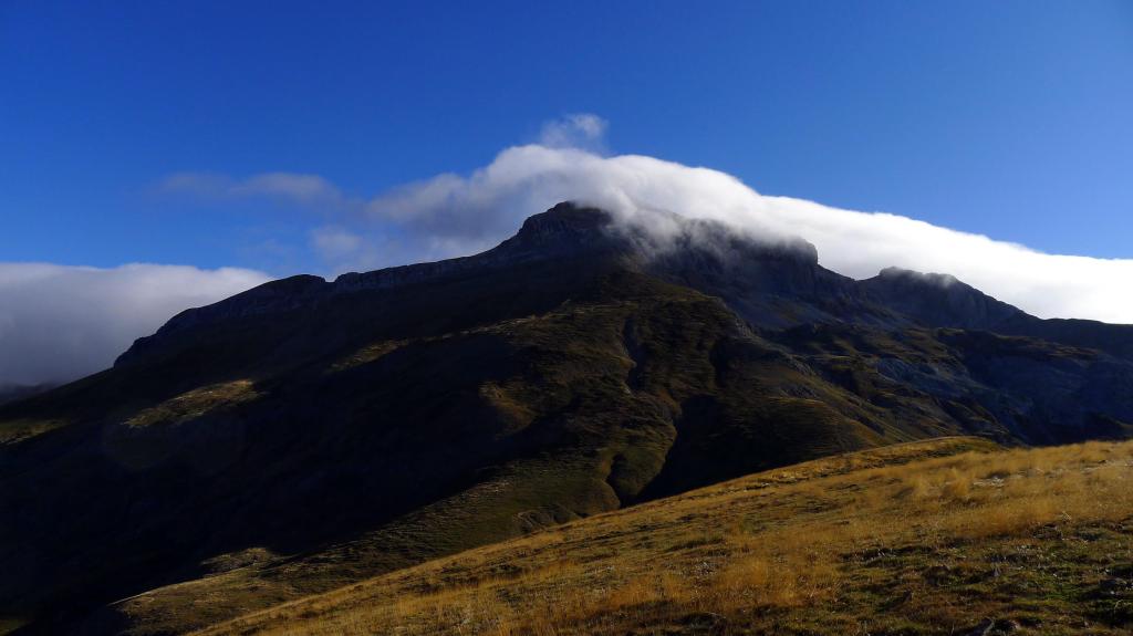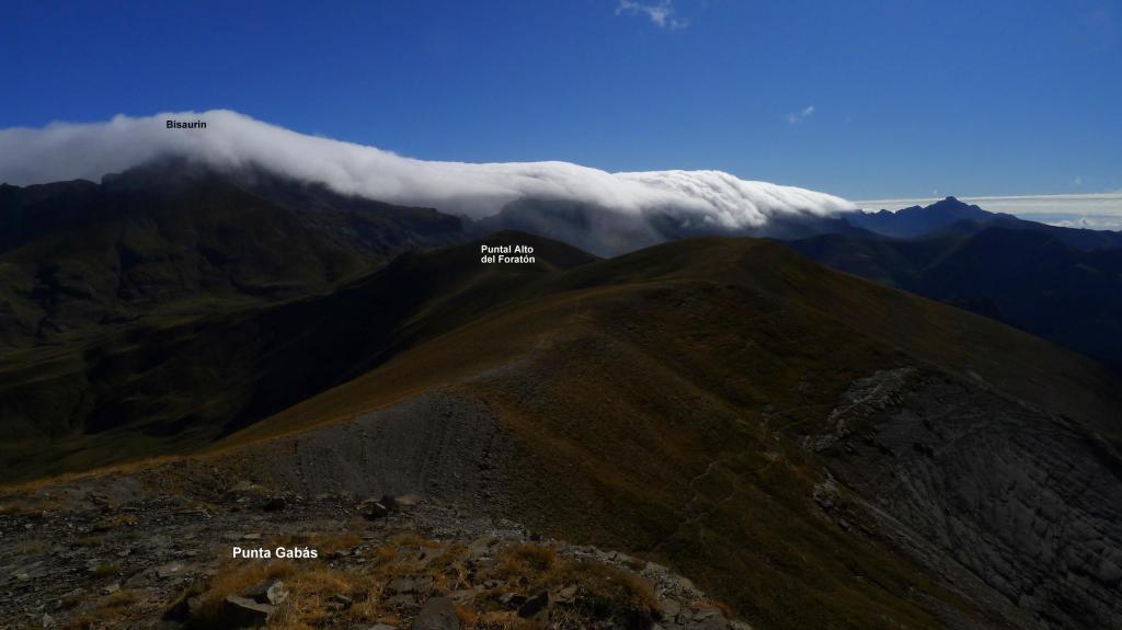 Escojo este recorrido porque hay fuerte viento de norte que trae mucha nubosidad de Francia, por lo que la parte francesa y los picos fronterizos no van a ser agradables, así que estas sierras, un poco más al sur, son una buena elección, con tiempo soleado pero, aún así, fuerte viento. Durante todo el cresterío tengo que llevar el cortavientos. Fijaos en el vídeo cómo pasan las nubes sobre el Bisaurín.