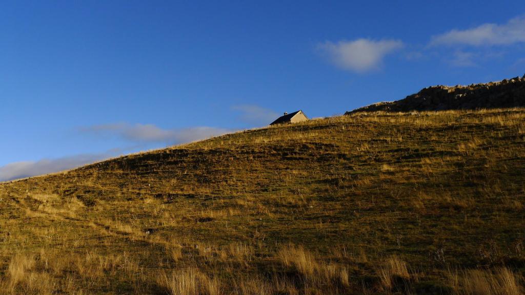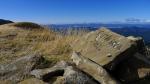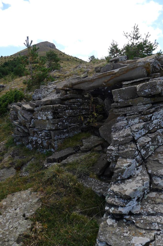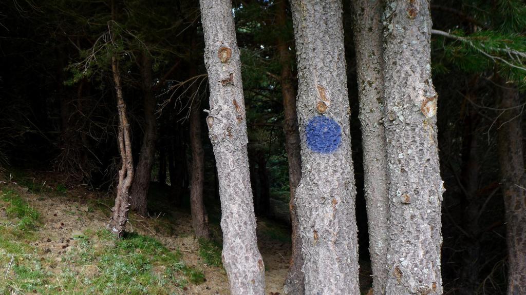 Comienza el descenso, primero por terreno de lajas. Encuentro un hito (1953m 3h32′) y los voy siguiendo, siempre por cresta, con una valla de alambre para el ganado a mi derecha. Después veo un hito a la derecha (1798m 3h43′) con unas lajas de piedra colocadas a modo de pequeño refugio o vivac. Dejo entonces la cresta y me voy a la derecha, bajando directo sin senda. Luego encuentro una senda que va hacia la izquierda y se mete en el pinar (1695m 3h53′); en el primer pino, al entrar en el bosque hay un círculo azul y sigue por el pinar hasta un punto en el que gira a la derecha (1650m 3h58′). Cuesta seguir la senda, pero vuelvo a encontrar la señal del círculo azul.