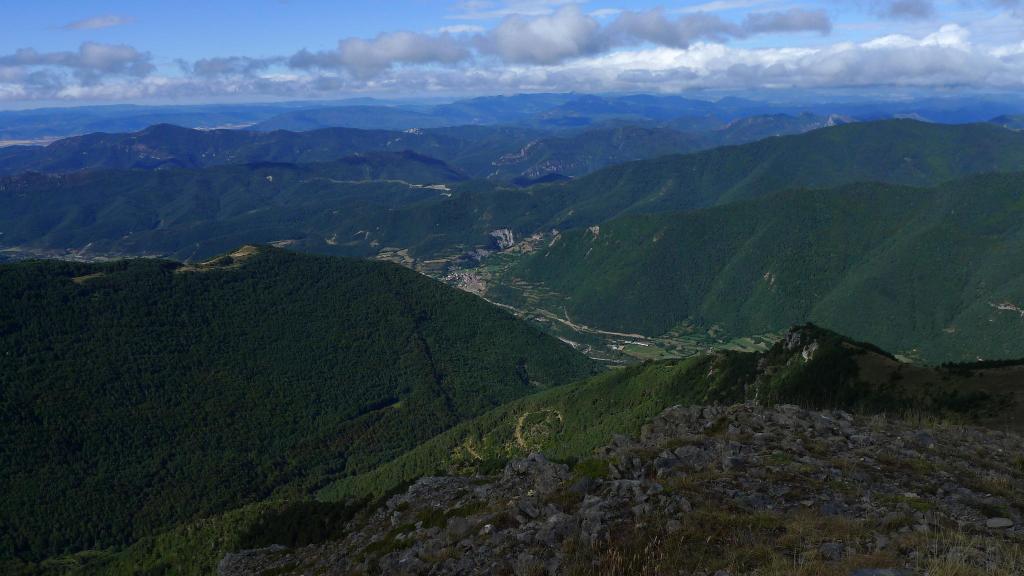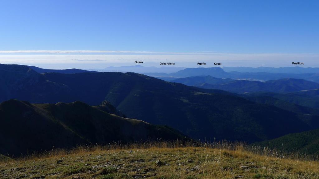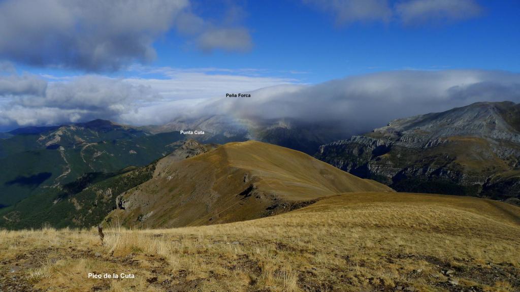 Siempre con espléndidas vistas y el viento fuerte, pero soportable, llego a la Punta Gabás (2143m 2h34′). La cresta gira al W, hacia el pico de la Cuta (2149m 2h48′). Se toma dirección NW a la Cuta Baja (2062m 3h06′), para finalmente afrontar las dos últimas cimas, que llevan el mismo nombre, la 1ª Punta de la Cuta (1996m 3h21′) y la más agreste 2ª Punta de la Cuta (2016m 3h25′).