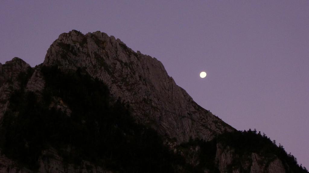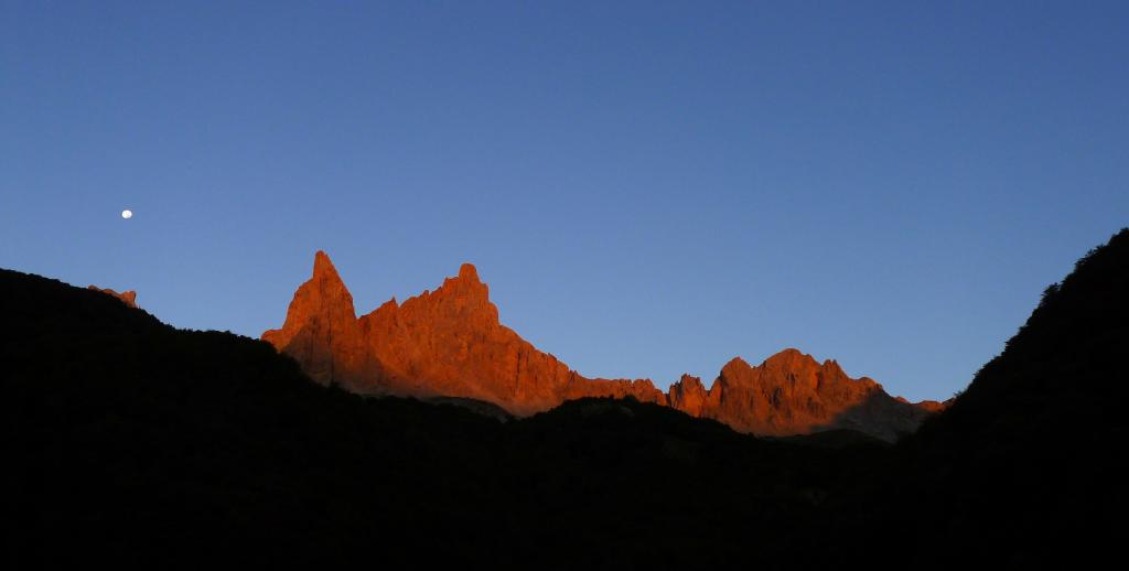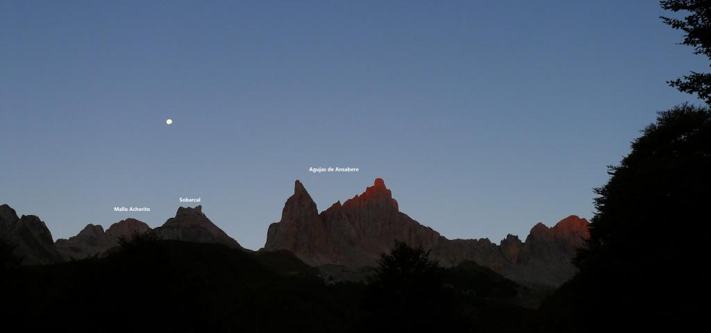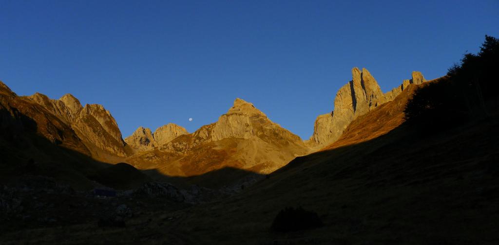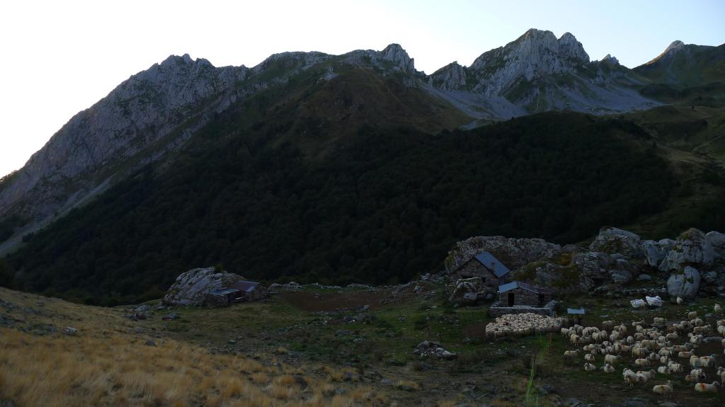 Se cruza el puente y se avanza por el camino en la orilla izquierda del río Ansabére. Las puntas de las agujas de Ansabére se encienden al amanecer, es una visión espectacular. Después de pasar la gran explanada del plateau d’Ansabére (1365m 0h27′) se asciende por el hayedo hasta las cabañas de pastores de Ansabère (1565m 0h50′), donde hay también un pequeño refugio libre. Hay gente todavía en los sacos vivaqueando por aquí y dentro del refugio.