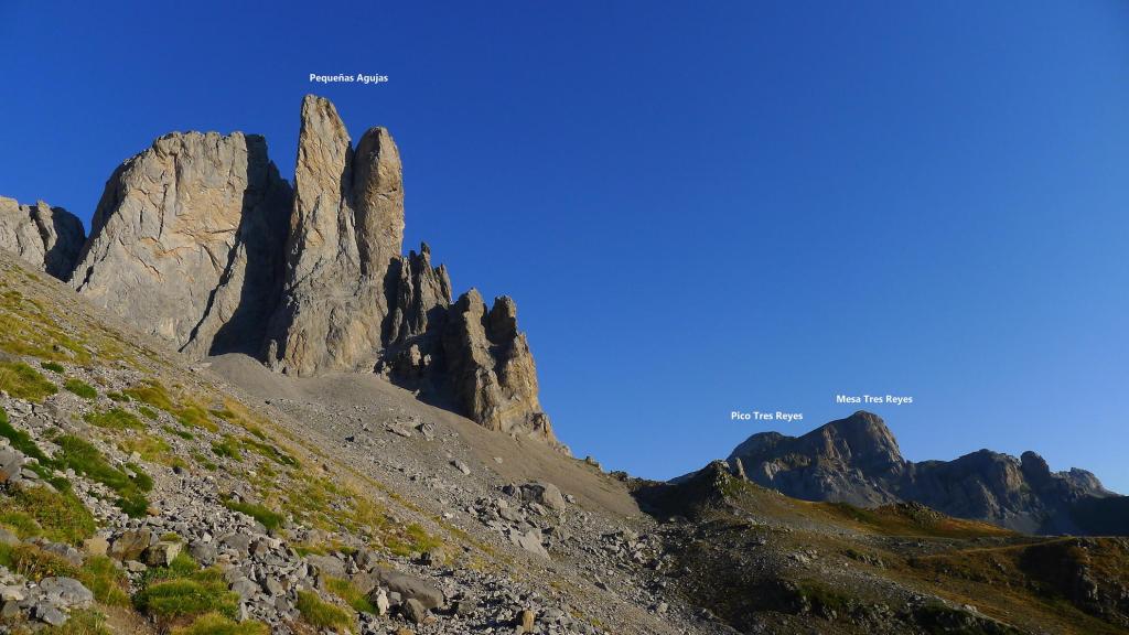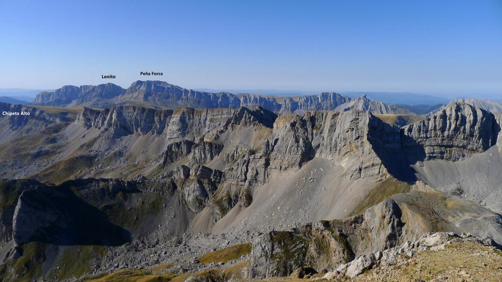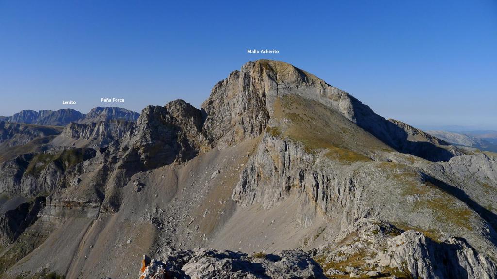 En un punto parece que la senda sube a la cresta, pero me encuentro en una cresta muy complicada y vuelvo un poco más abajo hasta un hito (2300m 2h46′) que marca otra senda a la derecha. Por aquí ya es una ladera fácil hasta la cima. Mallo de Acherito (2378m 2h52′). Ahora tengo una estupenda vista del Sobarcal que he subido antes. La bajada exige ser cuidadoso y no perder la ruta.