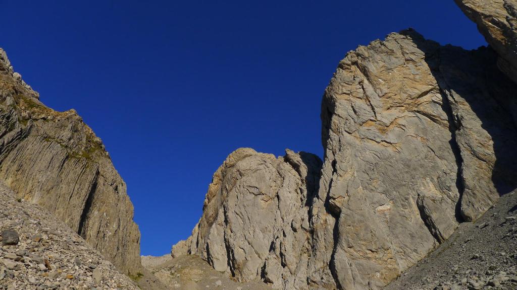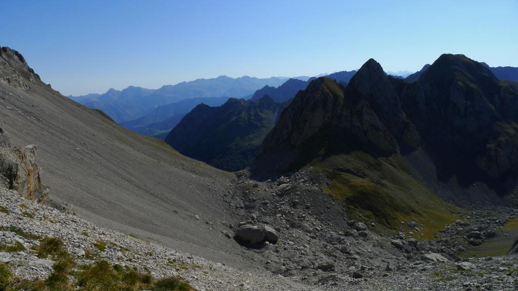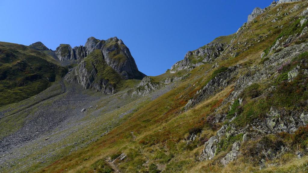 Vuelvo al collado de Acherito (2175m 3h33′). Mi intención es volver a Lescun por el valle de Acherito y el col de la Chourique, pero no veo nada claro el potente descenso de esta primera parte más vertical. Intento encontrar los pasos menos difíciles y sigo lo que parece una zona de tierrilla más pisada, aunque francamente, no sé si es la ruta más correcta. Luego cruzo una pedrera hacia mi derecha y desciendo por una canal justo por el límite entre la pedrera y la hierba para, finalmente, pillar la senda que flanquea por la pedrera y que, sin perder altura, me lleva al col de la Chourique o puerto de Acherito (1904m 4h05′).