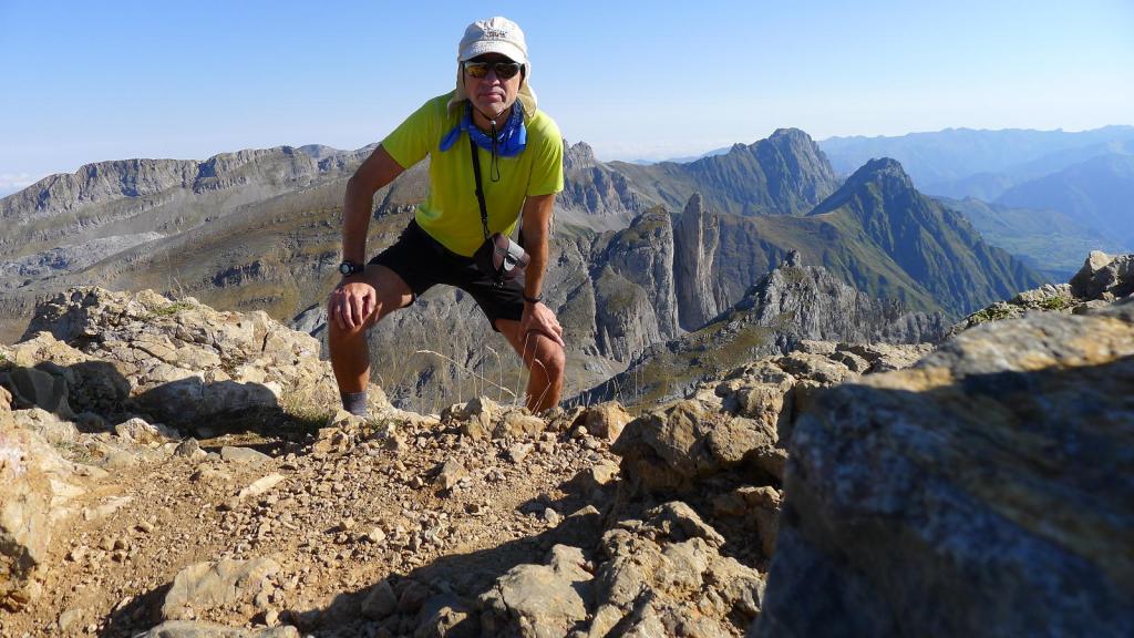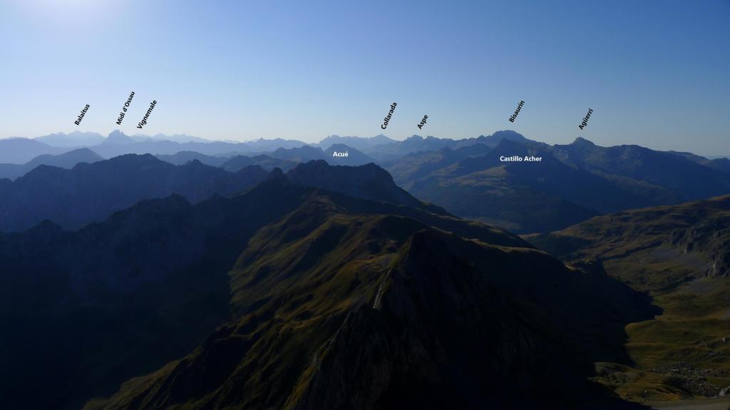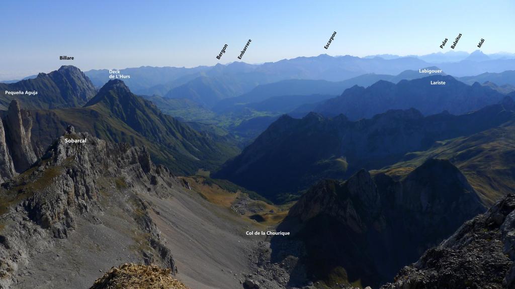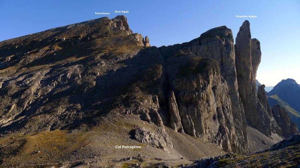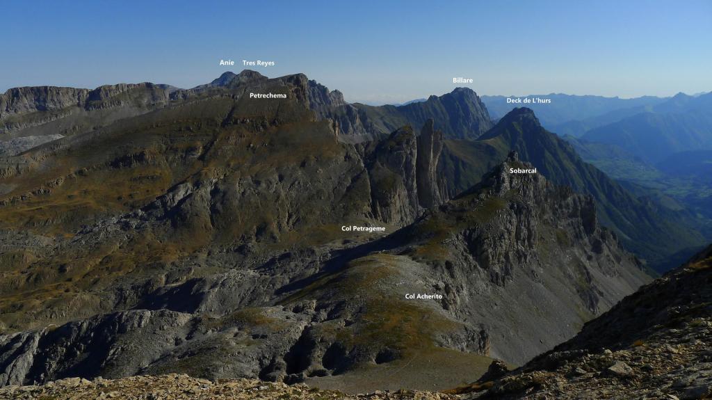 Se sube junto a la valla para el ganado (dirección W) siguiendo las señales de pintura amarilla. Hay varias sendas, pero la más cómoda es la que está balizada con pintura. Hay fuertes repechos bajo las paredes de las agujas de Ansabère para alcanzar el col de Pétragème o puerto de Ansó (2085m 1h43′). A la izquierda (sur) hay una traza de senda e hitos y, antes de llegar al amplio collado de Acherito, se gira a la izquierda para afrontar la parte final de la ascensión al Sobarcal, introduciéndose en una zona rocosa y y superando una trepada (Iº) justo antes de la cima. Sobarcal (2259m 2h02′). La vista del Petrechema y sus agujas es imponente.